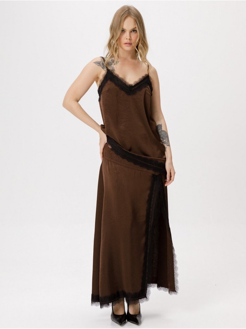 Костюм-двойка в бельевом стиле из асимметричного топа и юбки с кружевом.
