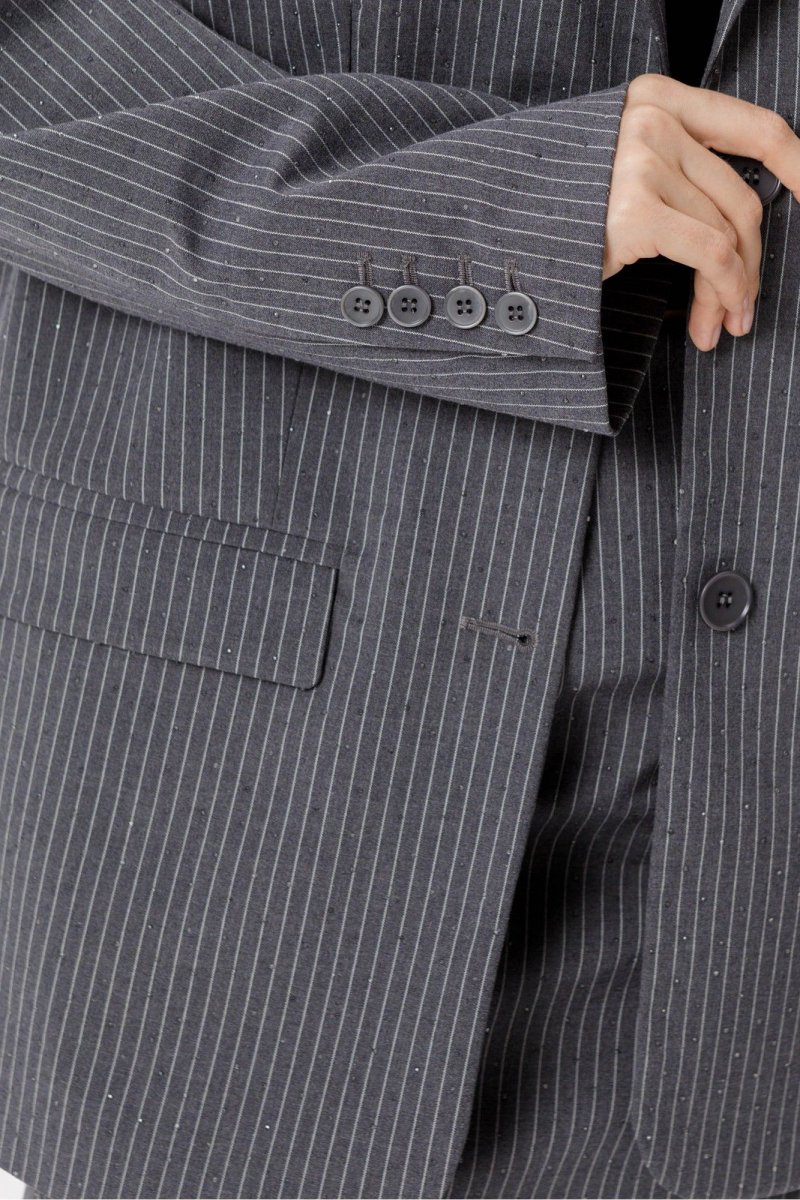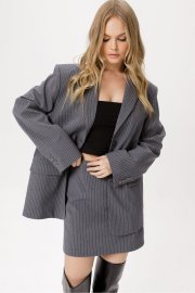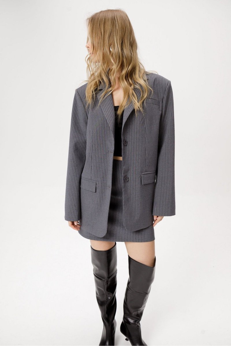 Костюм-двойка из оверсайз жакета и мини-юбки из текстильной ткани в тонкую полоску со стразами.