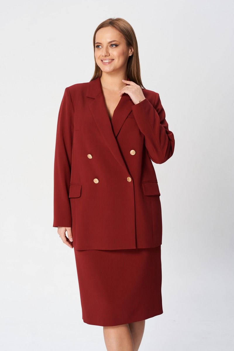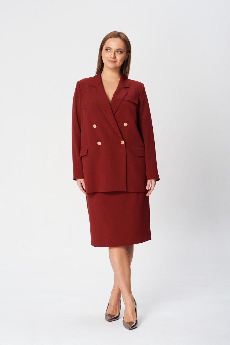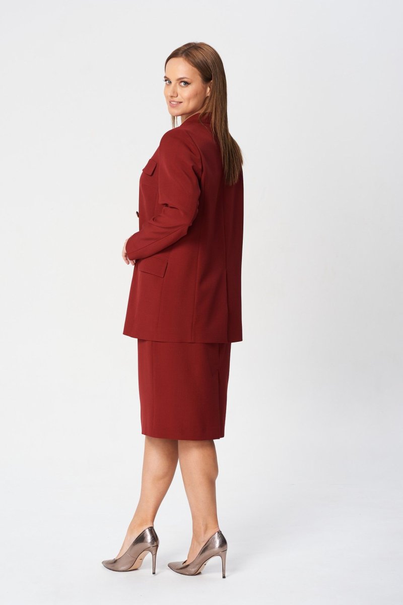 Костюм женский состоит из жакета и юбки. Жакет свободного кроя, выполнен на подкладке, застежка двубортная на петли и пуговицы, воротник пиджачного типа. Спереди карманы с клапаном. На левой полочке вверху - декоративный клапан. Спинка со шлицей. Юбка средней длины на поясе, слегка заужена к низу, на подкладке. В размерах 52-56 пояс на резинке. По центру заднего полотнища застежка на потайную молнию, щлица.