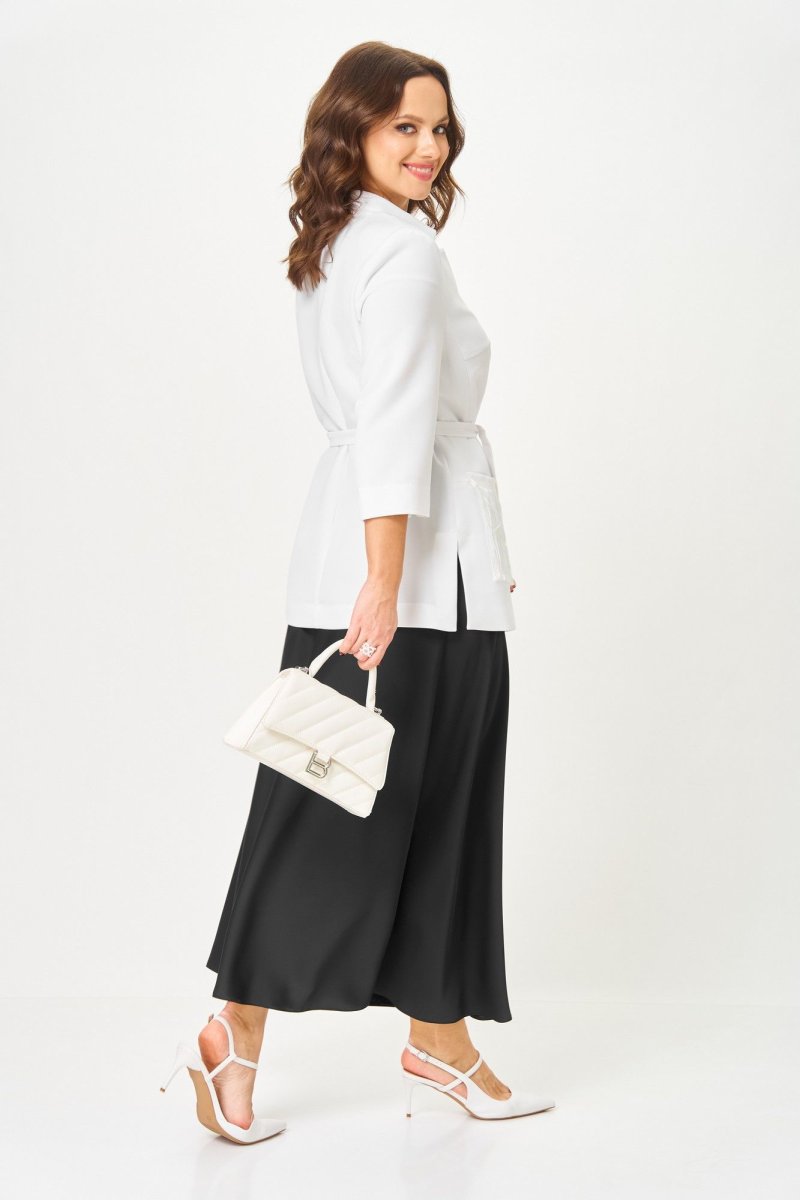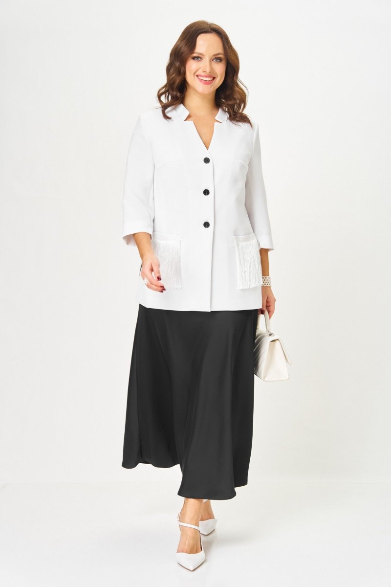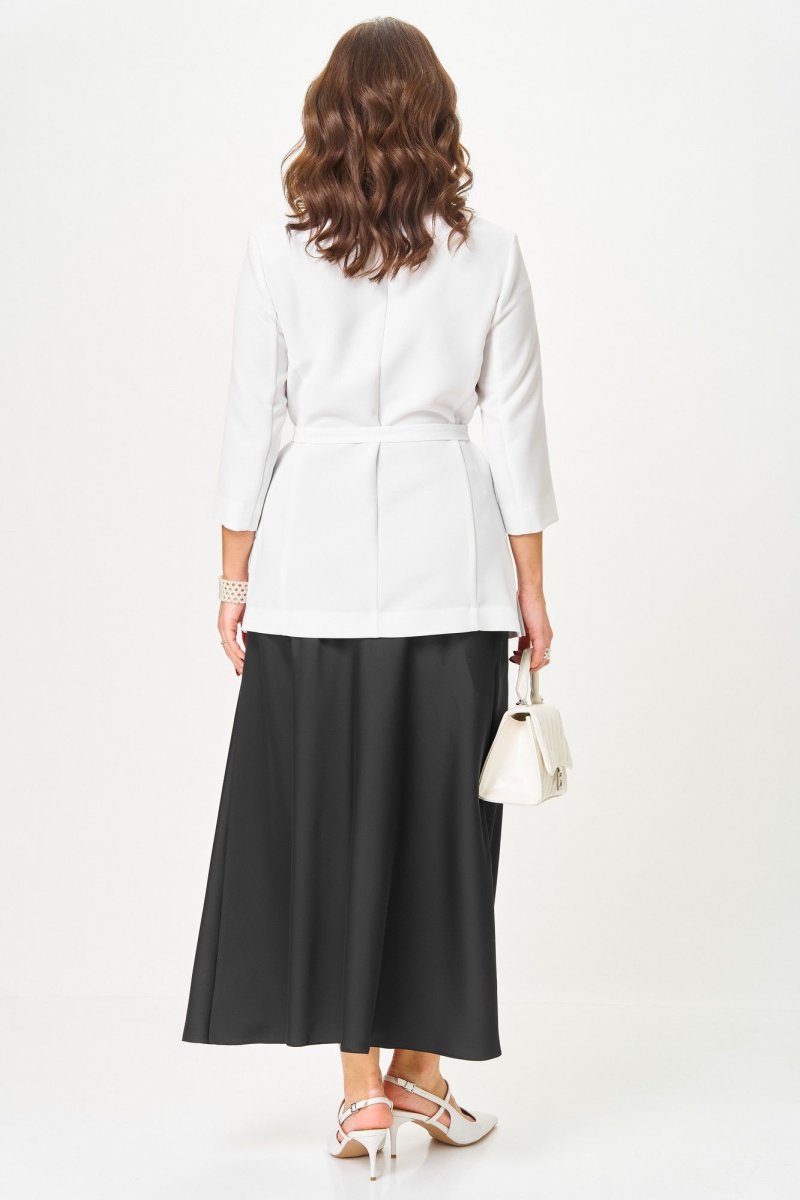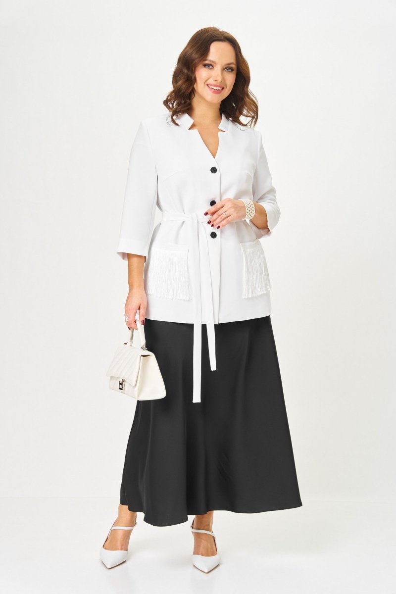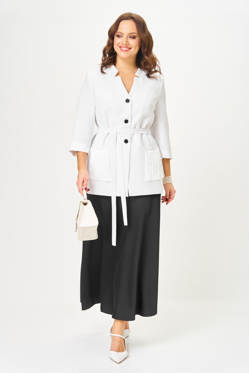 Комплект женский нарядный состоит из жакета и юбки. Жакет полуприлегающего силуэта из однотонной плательно-костюмной ткани, перед изделия на подкладке, центральная застежка на петли и пуговицы. Спинка со средним швом и вертикальными рельефами из проймы. По переду нагрудные вытачки, функциональные карманы с листочкой, декорированные тесьмой, в боковых швах разрезы. Горловина фигурной формы с плосколежащей стойкой. Рукав втачной двухшовный 3/4 длиной. В комплекте сьемный пояс из основной ткани. Юбка миди из плотного струящегося атласа расклешенная к низу, на поясе, с резинкой.