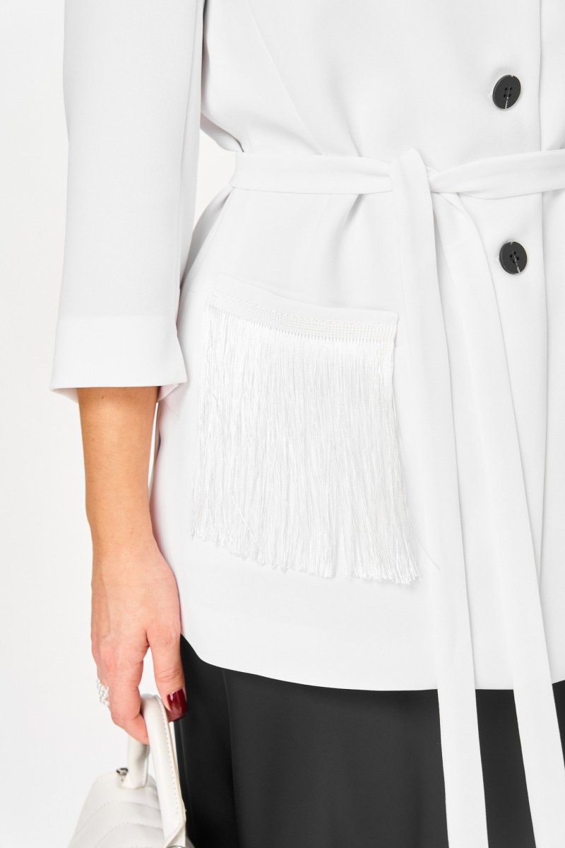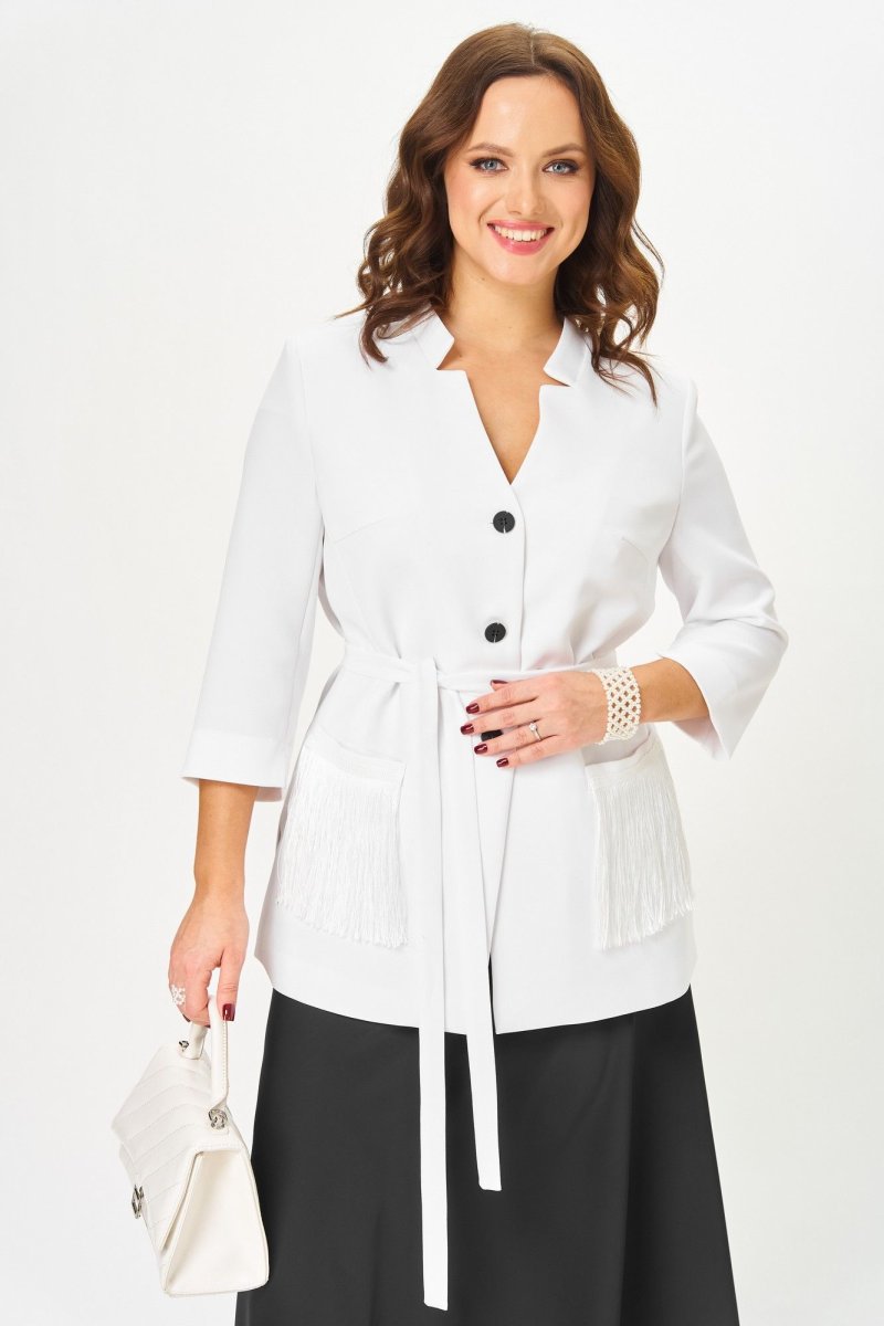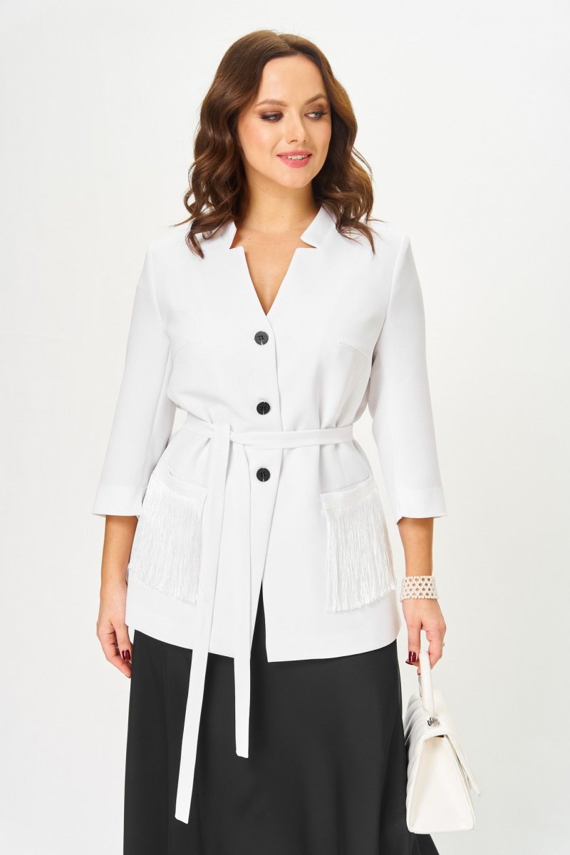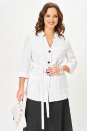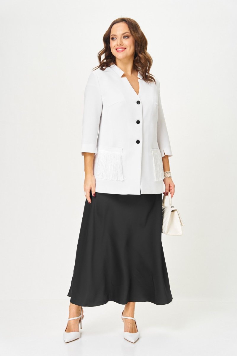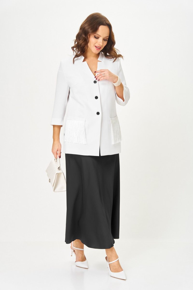 Комплект женский нарядный состоит из жакета и юбки. Жакет полуприлегающего силуэта из однотонной плательно-костюмной ткани, перед изделия на подкладке, центральная застежка на петли и пуговицы. Спинка со средним швом и вертикальными рельефами из проймы. По переду нагрудные вытачки, функциональные карманы с листочкой, декорированные тесьмой, в боковых швах разрезы. Горловина фигурной формы с плосколежащей стойкой. Рукав втачной двухшовный 3/4 длиной. В комплекте сьемный пояс из основной ткани. Юбка миди из плотного струящегося атласа расклешенная к низу, на поясе, с резинкой.
