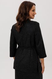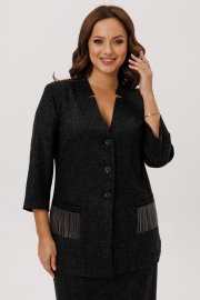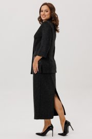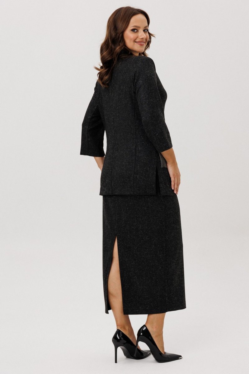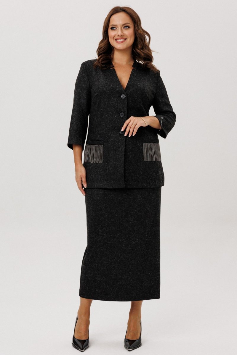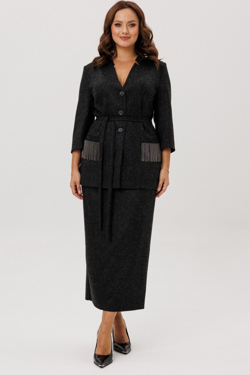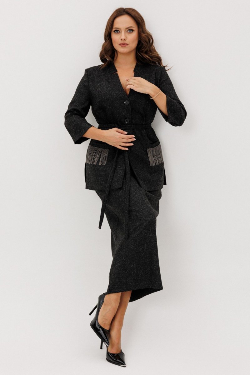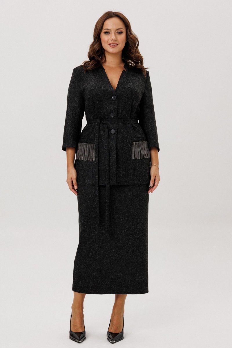 Комплект женский в классическом стиле с юбкой миди. Изготовленный из однотонной ткани с декоративным ворсом, создающим эффект меланжа. Жакет удлиненный прямого силуэта без подкладки. По переду застежка на петли и пуговицы, нагрудные вытачки от рельефа, функциональные карманы листочка с декоративной бахромой. По спинке средний шов и вертикальные рельефы из проймы. В боковых швах разрезы. Рукав втачной двухшовный с небольшим разрезом в переднем шве. По горловине воротник стойка. Юбка миди на поясе с резинкой по бокам, на подкладке. По переднему полотнищу талиевые вытачки, по заднему полотнищу средний шов с застежкой на потайную молнию и разрезом внизу. В комплекте сьемный мягкий пояс из основной ткани.
