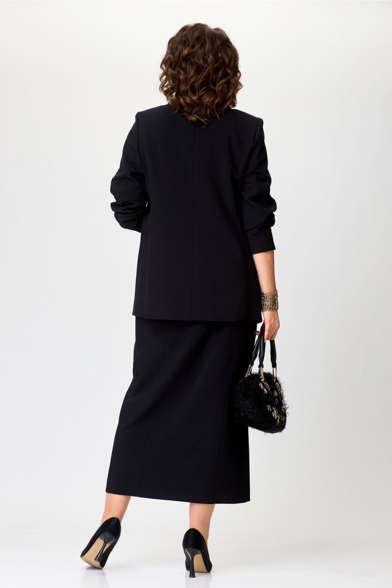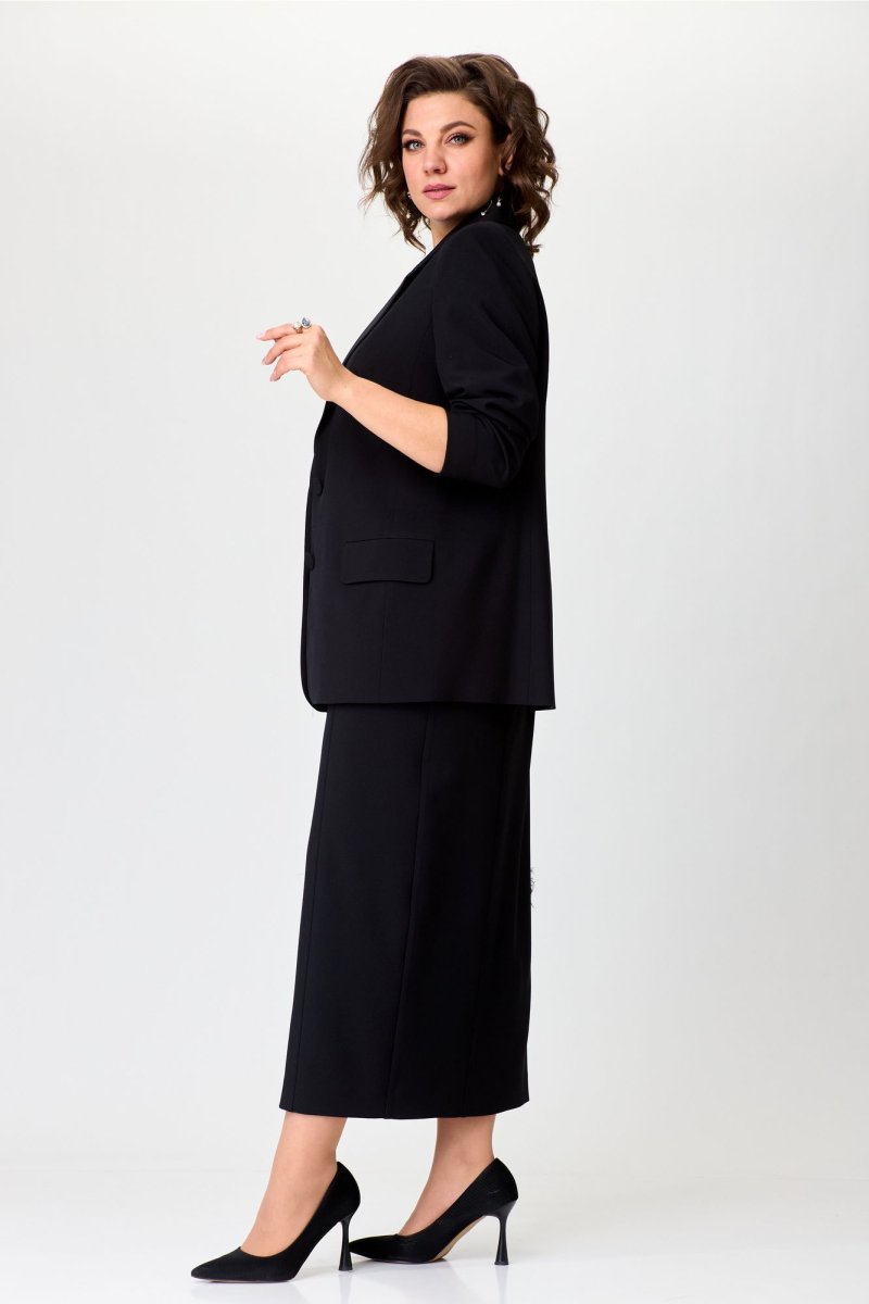 Жакет прямого силуэта с намеком на полуприлегание, с застежкой на две петли и две пуговицы. Перед жакета с рельефами, нагрудными вытачками и прорезными карманами с клапаном. Спинка жакета со средним швом. Длина жакета - до середины бедра. Рукава двухшовные втачные. Горловина оформлена воротником пиджачного типа. Чёрный жакет отлично будет смотреться как с формальными, так и с более повседневными комплектами одежды.