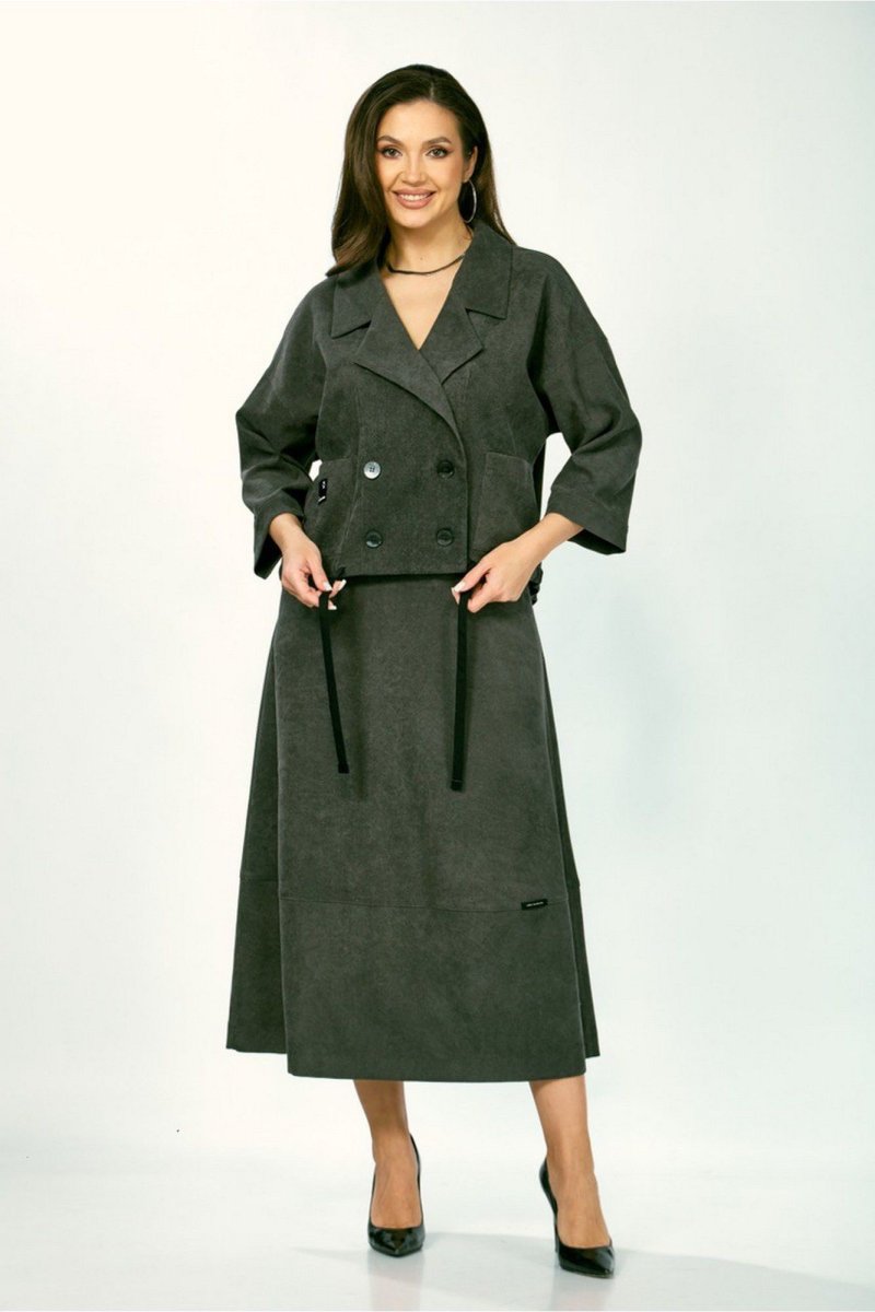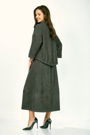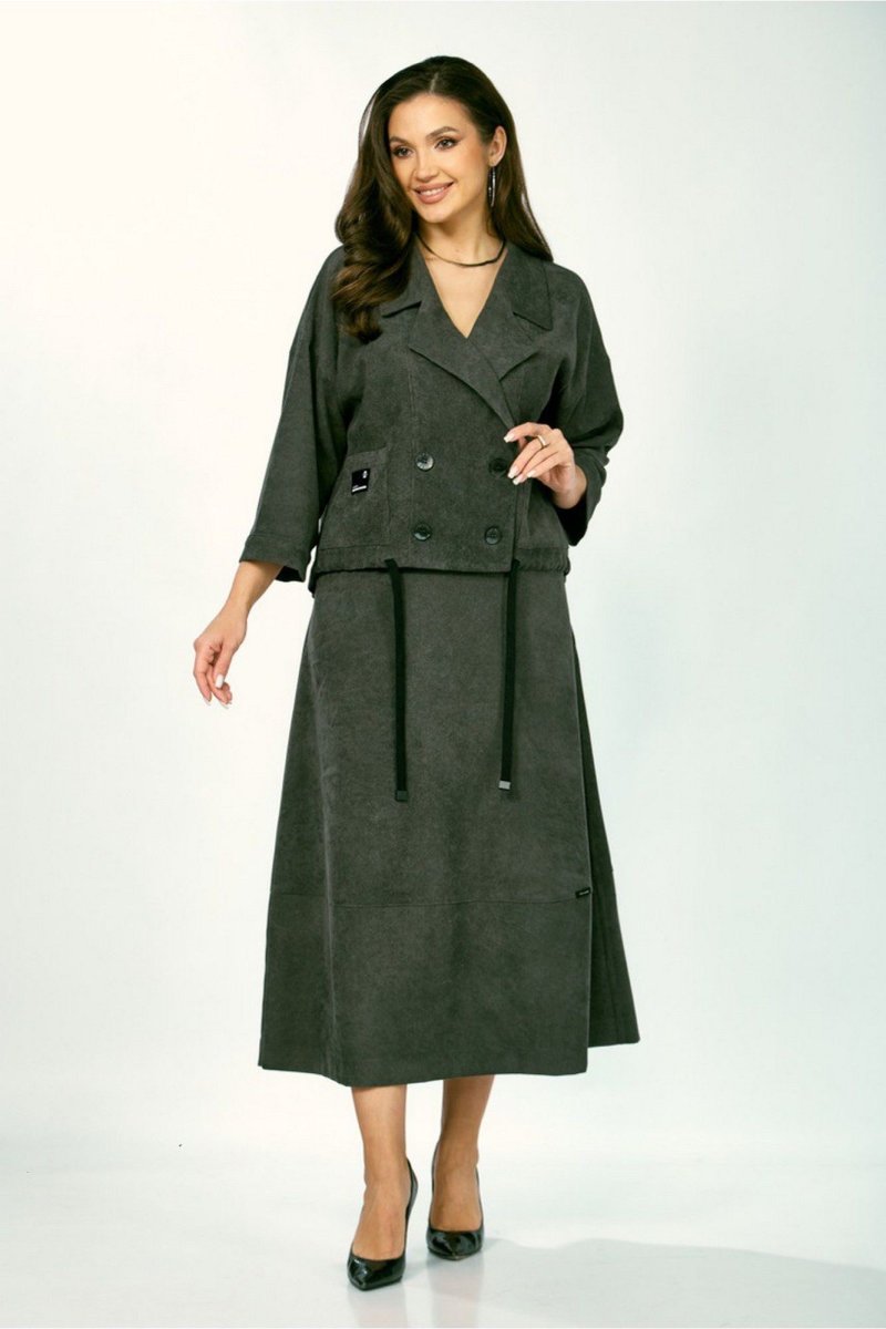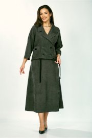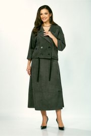 Юбка А-силуэта сверху на притачном поясе, по бокам с резинкой, создает стройный силуэт. На переднем полотнище юбки обработаны карманы с отрезным бочком, по низу-отрезная деталь,завершающая образ. Костюм декорирован нашивками в тон оновной ткани. Его приятно надеть и на работу и на прогулку с друзьями.