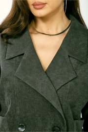 Жакет прямого силуэта со спущенной линией плеча и рубашечным рукавом добавляет характер. На полочке расположен вертикальный рельеф от линии плеча и настрочен накладной карман. Низ жакета обработан тройной обтачкой на которой расположена петля и протянут шнур. Низ рукава с притачной манжетой. Воротник пиджачного типа. Застежка двухбортная на петли и пуговицы.