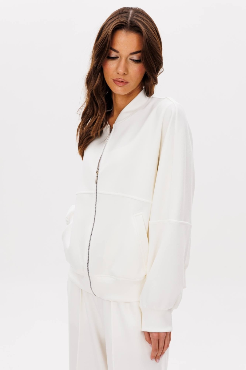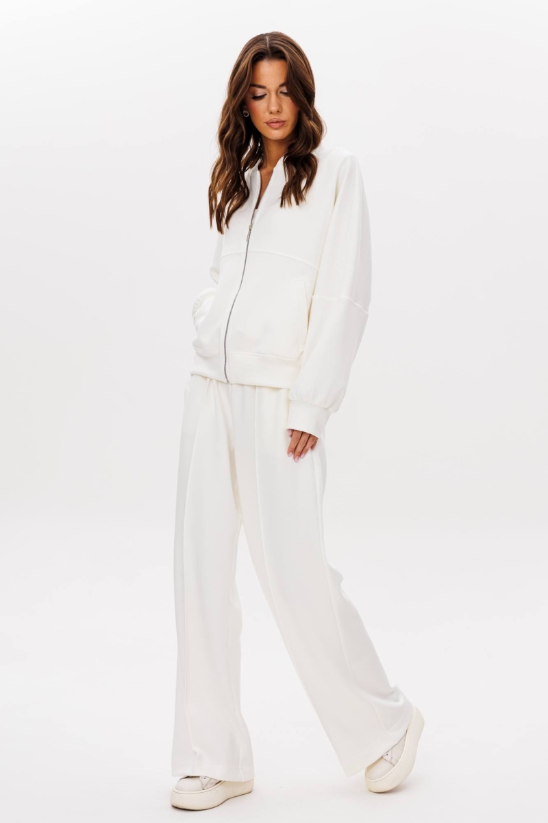 Костюм состоит из свободной лёгкой куртки на разъёмной тесьме -молнии и прямых брюк.