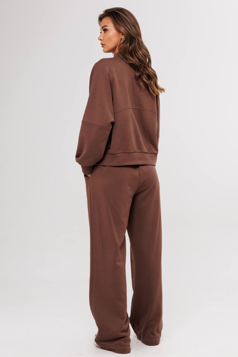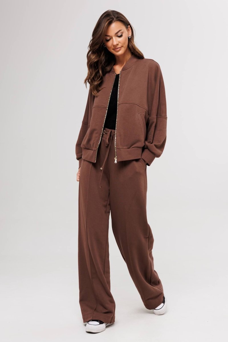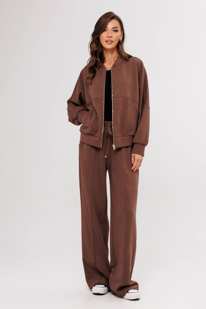 Спортивный костюм сегодня - это не только одежда для спорта гардероба любой современной девушки - он является ещё и элементом стиля.Спортивный костюм в шоколадном цвете будет уместен везде и всегда, несмотря на любые веяния моды. Костюм состоит из свободной лёгкой куртки и прямых брюк. Акцентом в куртке служит разъёмная тесьма-молния леопардового цвета. Цельнокроеный покрой актуален, он идеально обеспечивает свободу движений. Воротник в виде мягкой стойки, по переду спинки и рукавам - акцентные рельефы, подчёркнутые отделочными строчками. Для удобства использования - прорезные карманы с листочками.Низ куртки и рукавов - на притачных манжетах.Брюки свободные, с вертикальными защипами-стрелками на передних половинках визуально удлиняют и стройнят. Предусмотрены боковые карманы. Пояс брюк с эластичной лентой и регулировкой на шнур спереди.Фурнитура - металлическая тесьма, эмблема на спинке, текстильный шнур. Длина изделия по спинке-около 58 см. Длина рукава от шва притачивания воротника с плечом - около 72 см. Длина брюк около 106 см