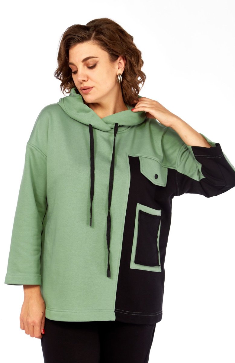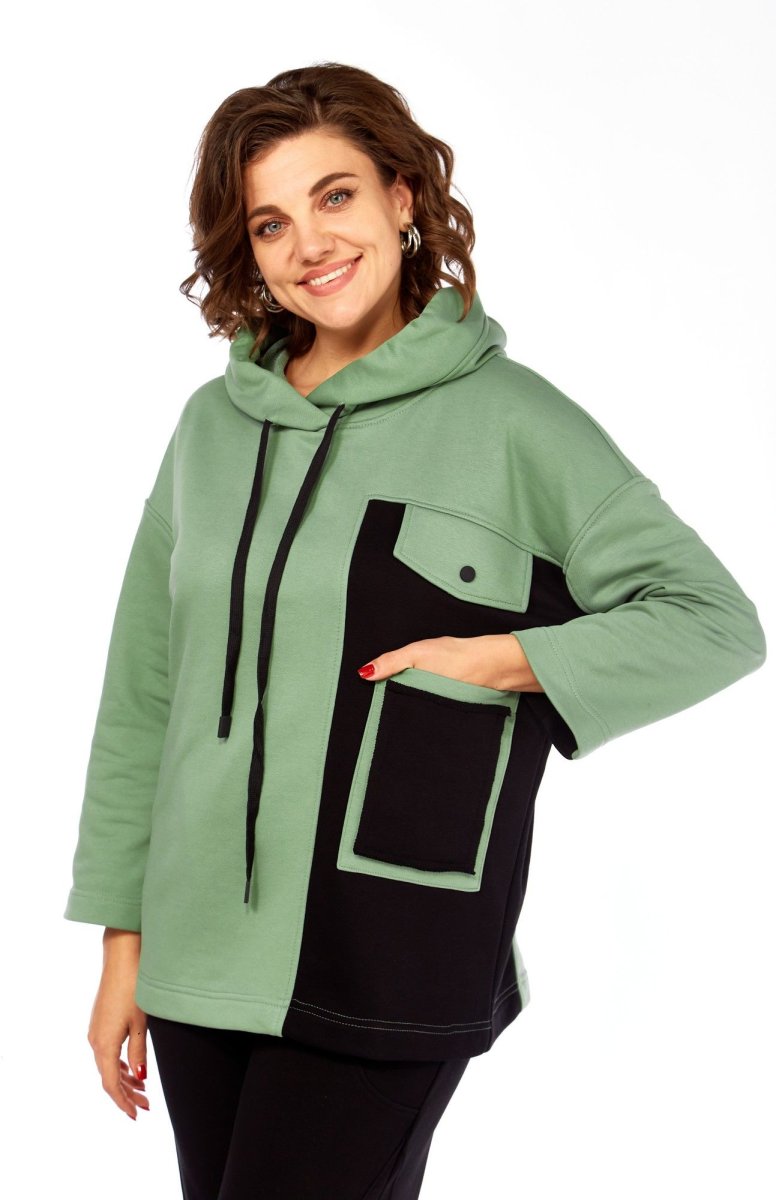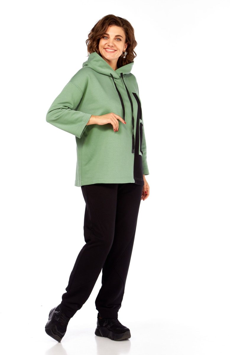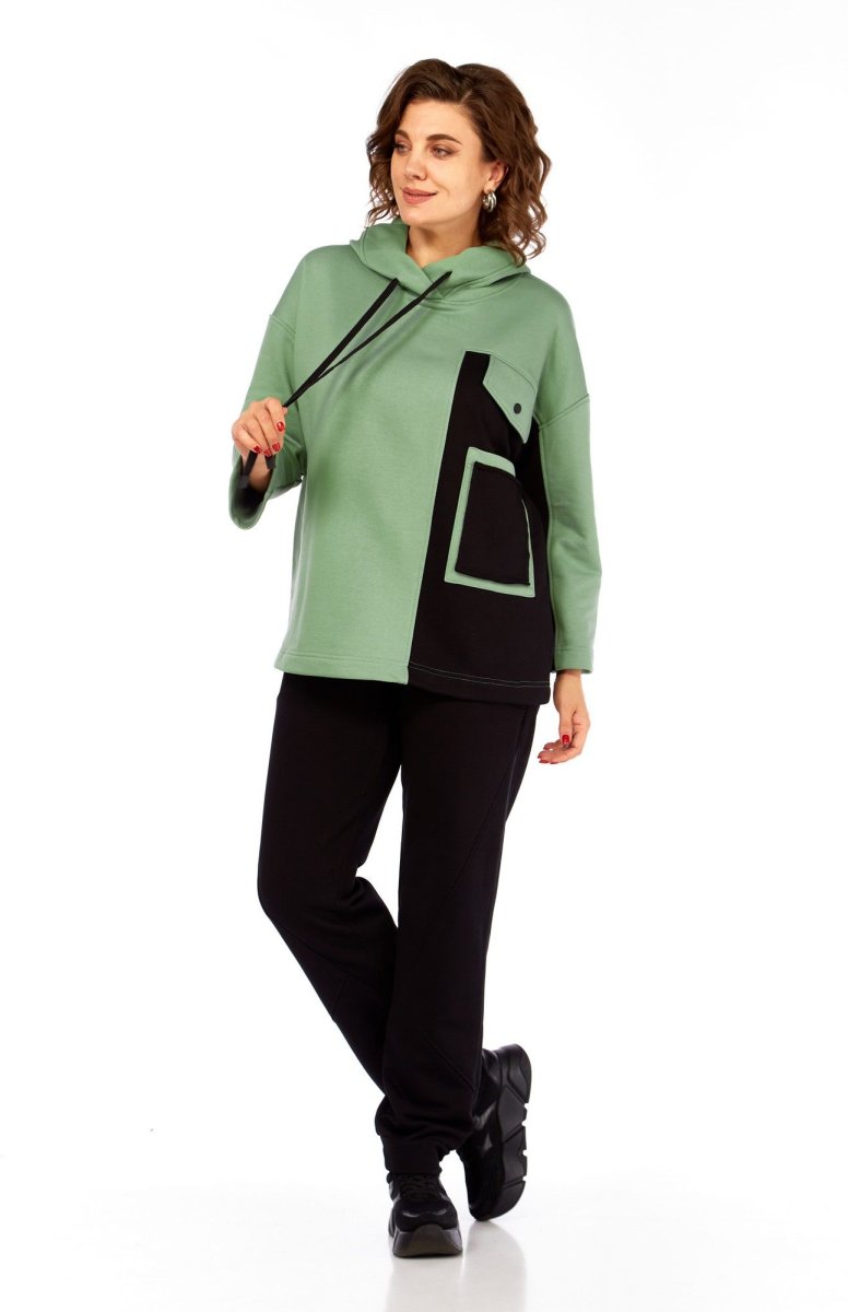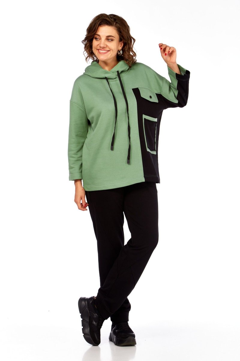 Удобный и практичный повседневный женский комплект в стиле спорт-шик из качественного футера трехнитка. Данная модель состоит из спортивных брюк и объемного худи в сочетании контрастных тканей. Перед ассиметричный с накладным карманом и декоративным клапаном. Горловина оформлена капюшоном. Спинка прямая. Рукав двухшовный со спущенной линией плеча длиной 7/8.