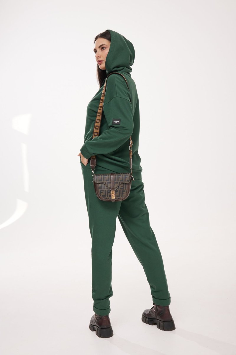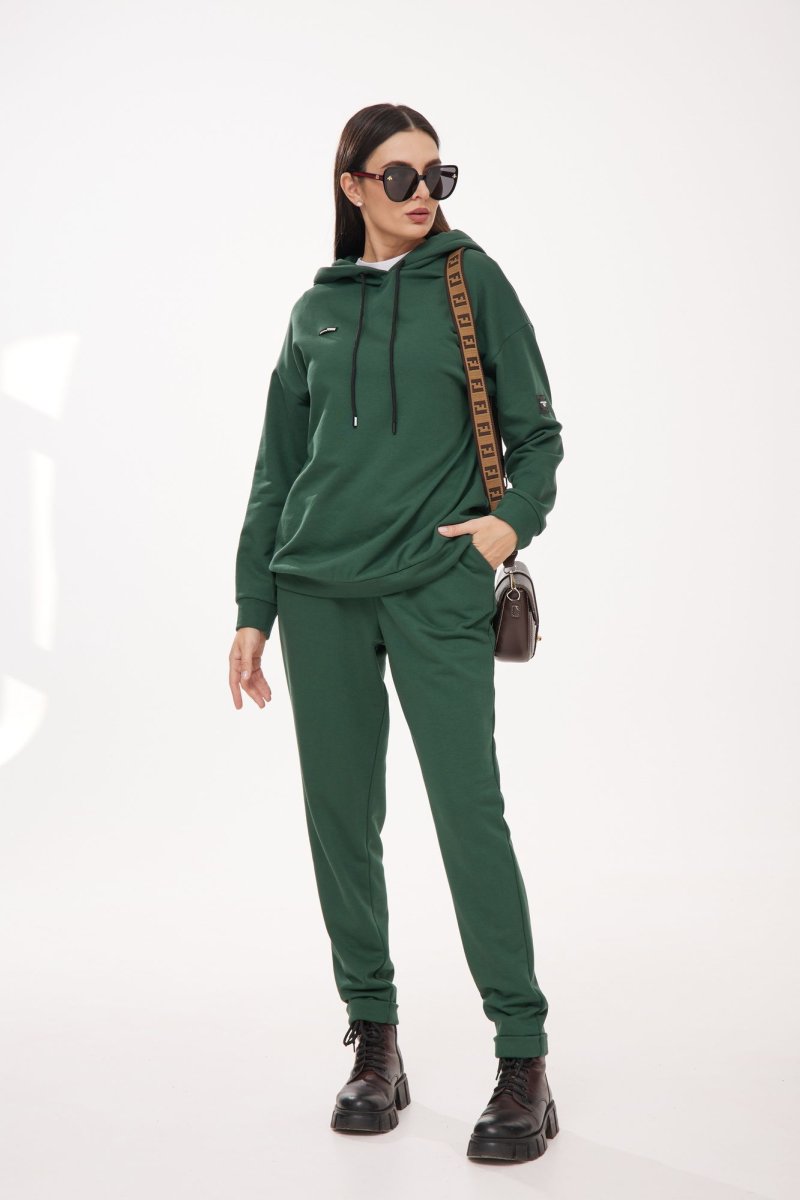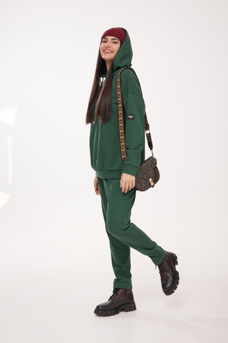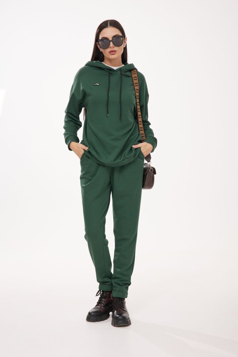 Костюм двойка включает в себя брюки с цельнокроенной манжетой и удлиненного худи с капюшоном.