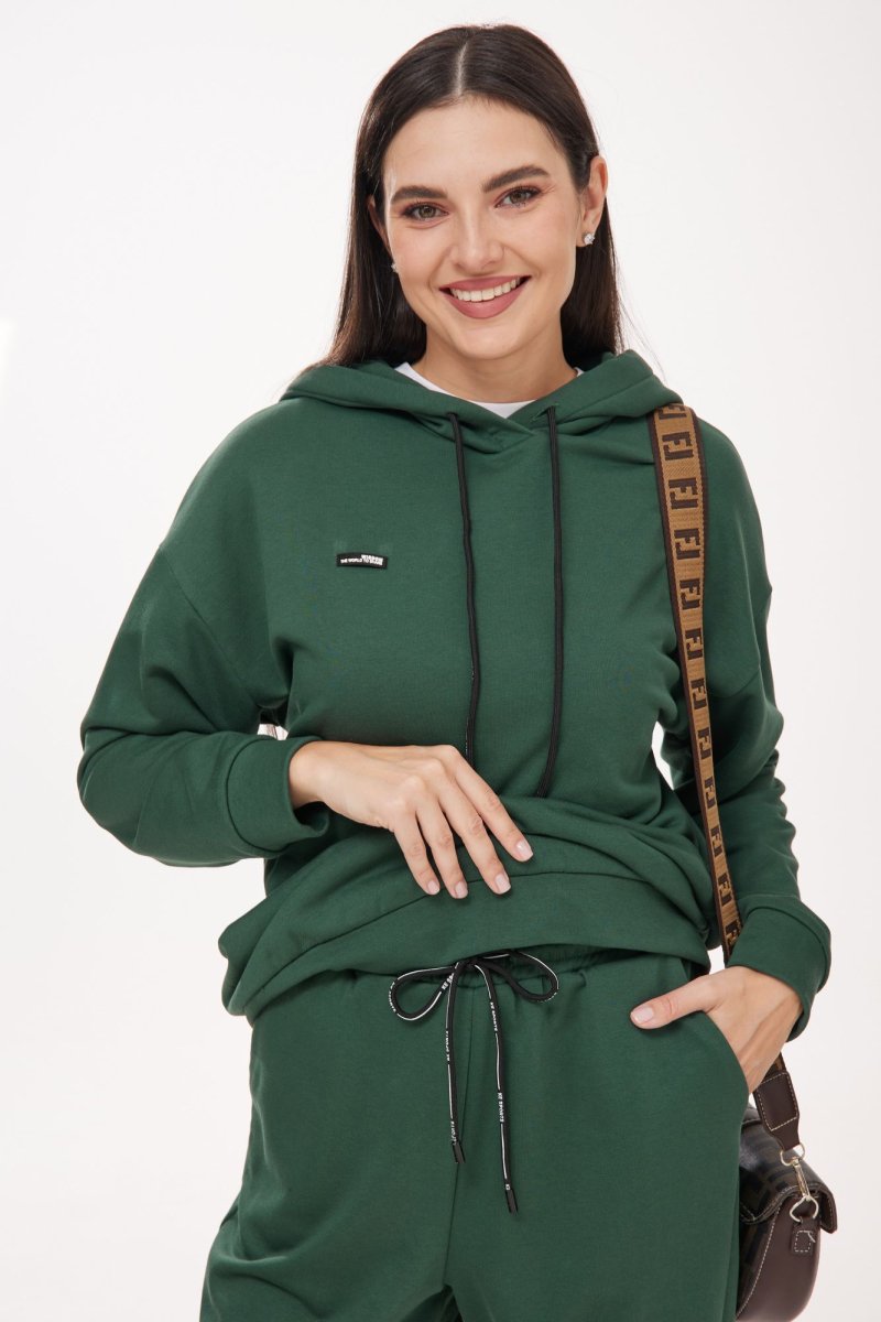 Худи прямого свободного силуэта со спущенным плечом и втачным рукавом. По груди и в области плеча -декоративные нашивки. Низ худи и низ рукава обработан притачной манжетой. Горловина худи с капюшоном, который регулируется декоративным шнурком.