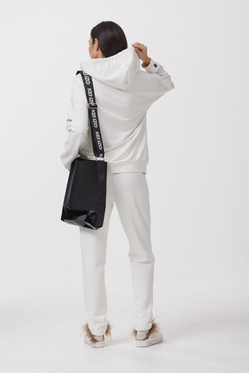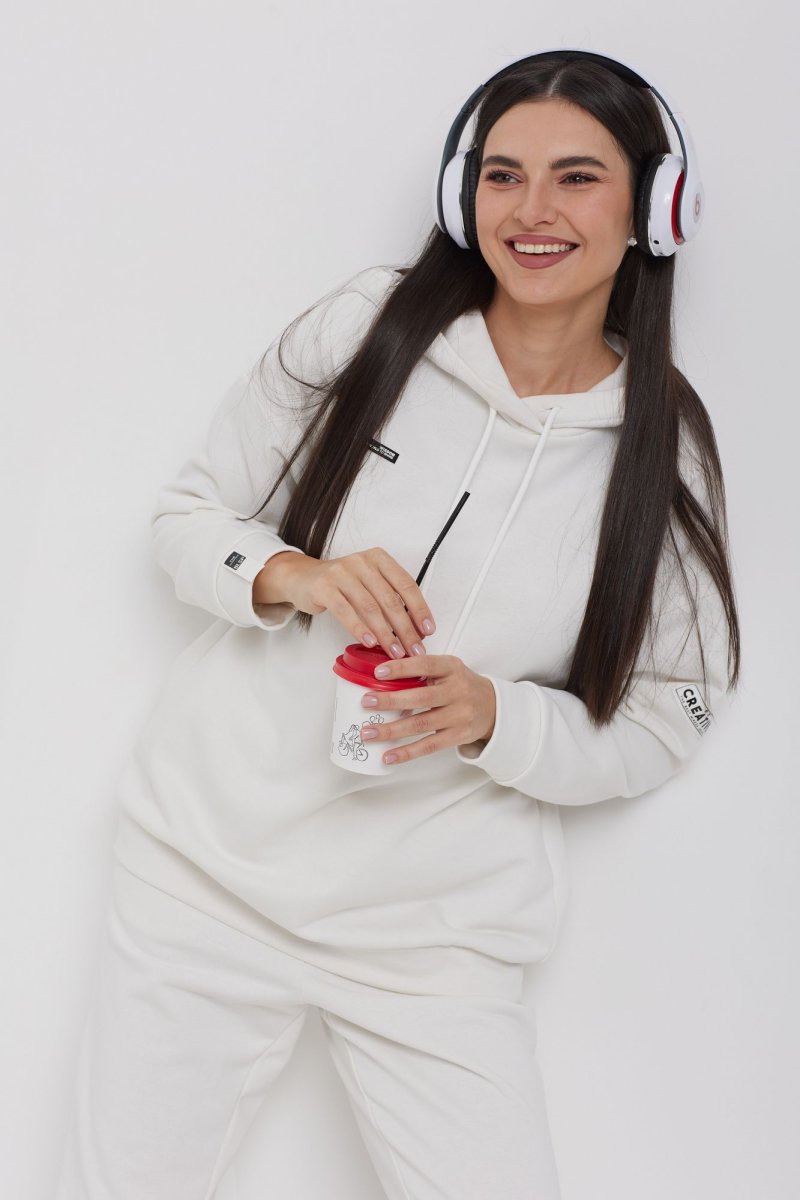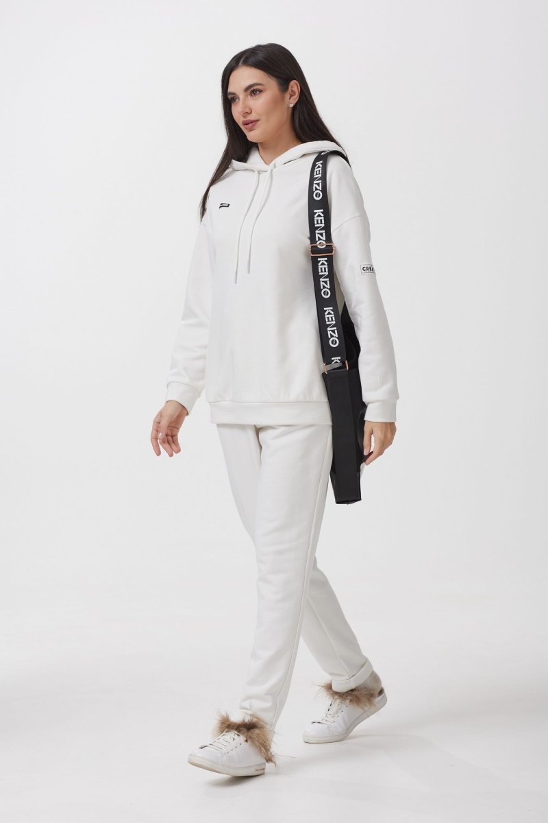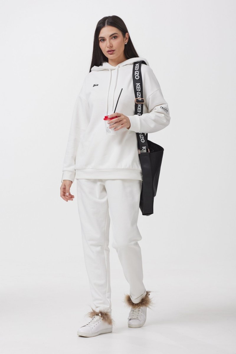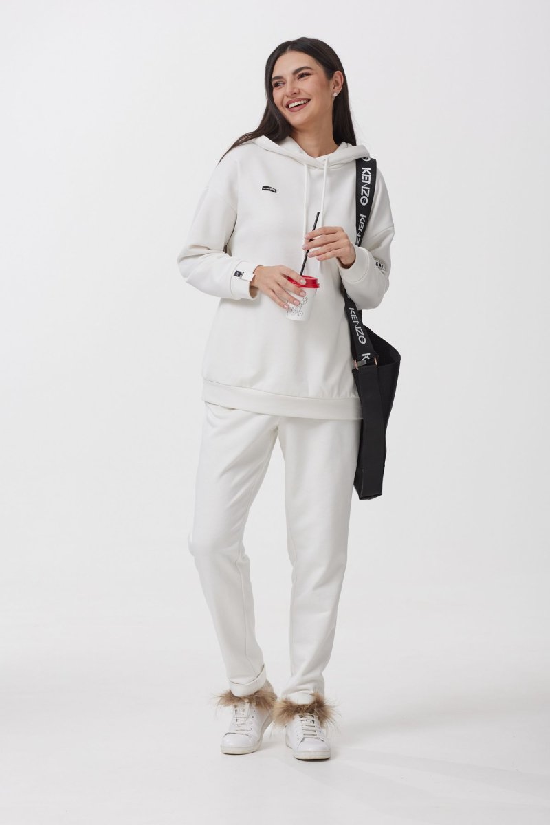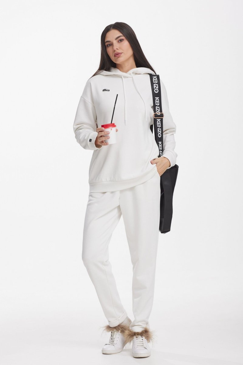 Костюм двойка включает в себя брюки с цельнокроенной манжетой и удлиненного худи с капюшоном.