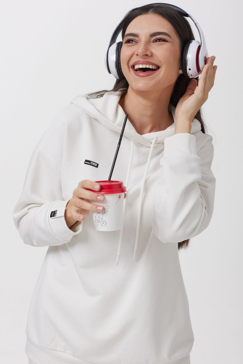 Худи прямого свободного силуэта со спущенным плечом и втачным рукавом. По груди и в области плеча -декоративные нашивки. Низ худи и низ рукава обработан притачной манжетой. Горловина худи с капюшоном, который регулируется декоративным шнурком.