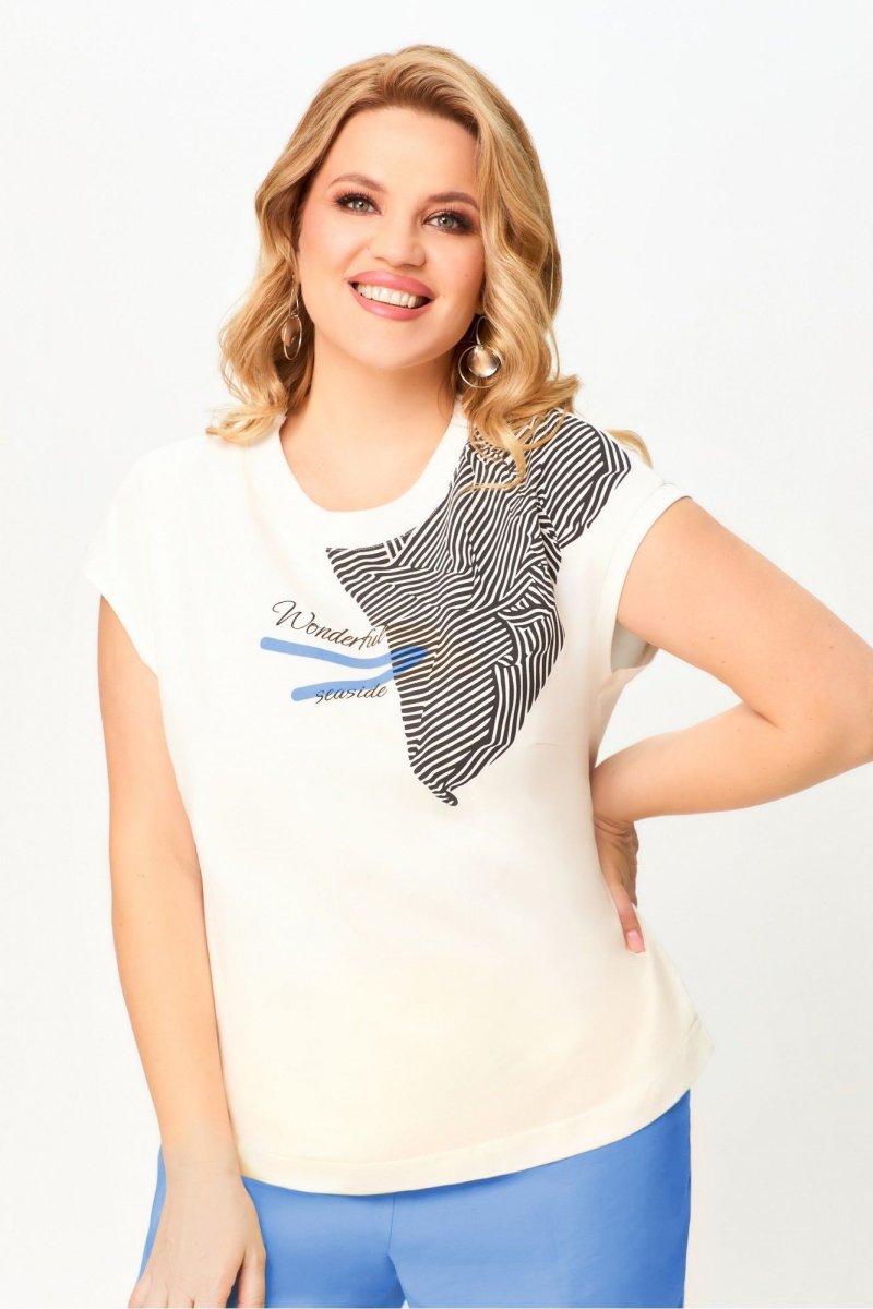 Джемпер женский, свободного силуэта, со спущенной линией плеча, длиной до линии бедер. На детали переда джемпера нанесена декоративная печать, вырез горловины округлой формы, с втачной декоративной бейкой. Проймы обработаны втачными бейками. Длина спинки – 62см.