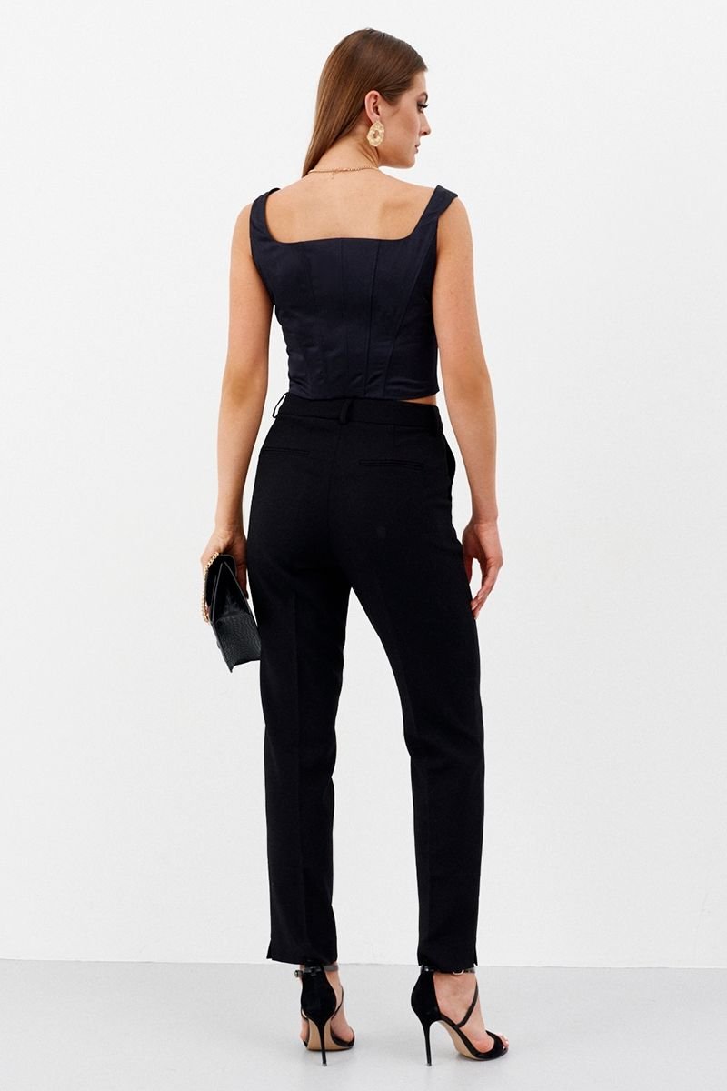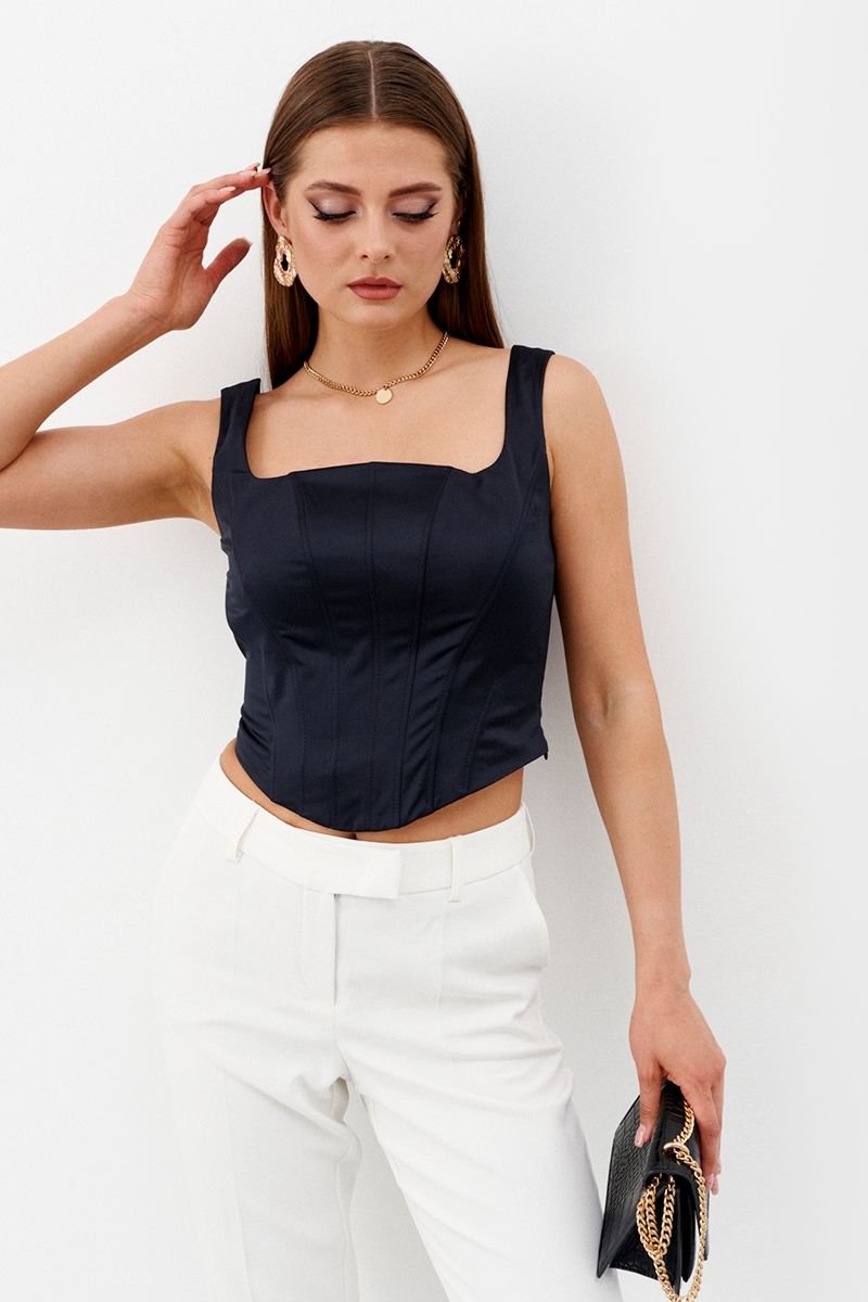 Корсет выполнен на боковую застежку – потайная молния в шве. Корсет имеет декоративные подрезы, для жесткости вставлены регилины. Низ ассиметричный и фигурный, корсет дополнен глубоким квадратным вырезом.
