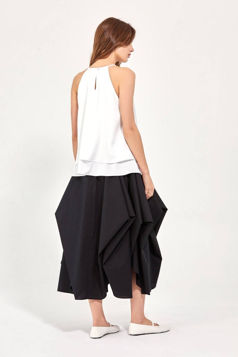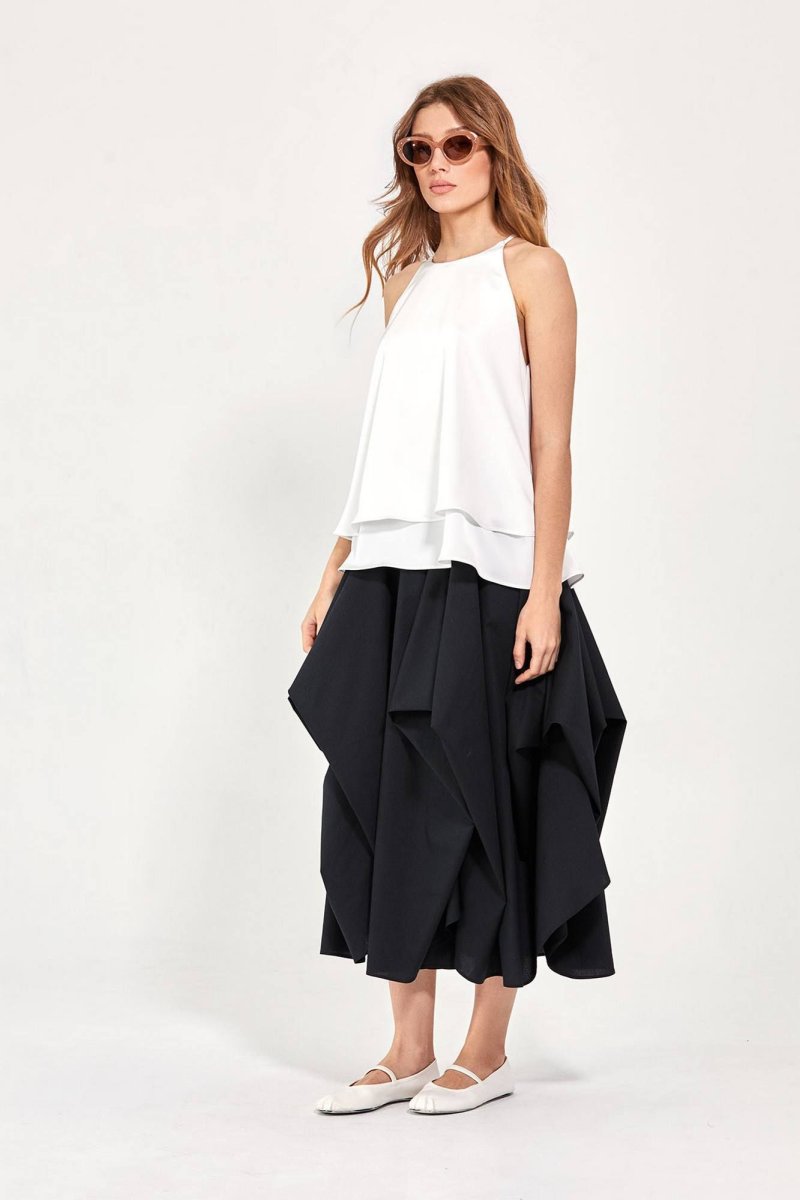 Топ: - силуэт-трапеция - американская пройма - на спинке разрез с застёжкой на петлю и пуговицу - двойной слой ткани: верхний короче нижнего на 8 см