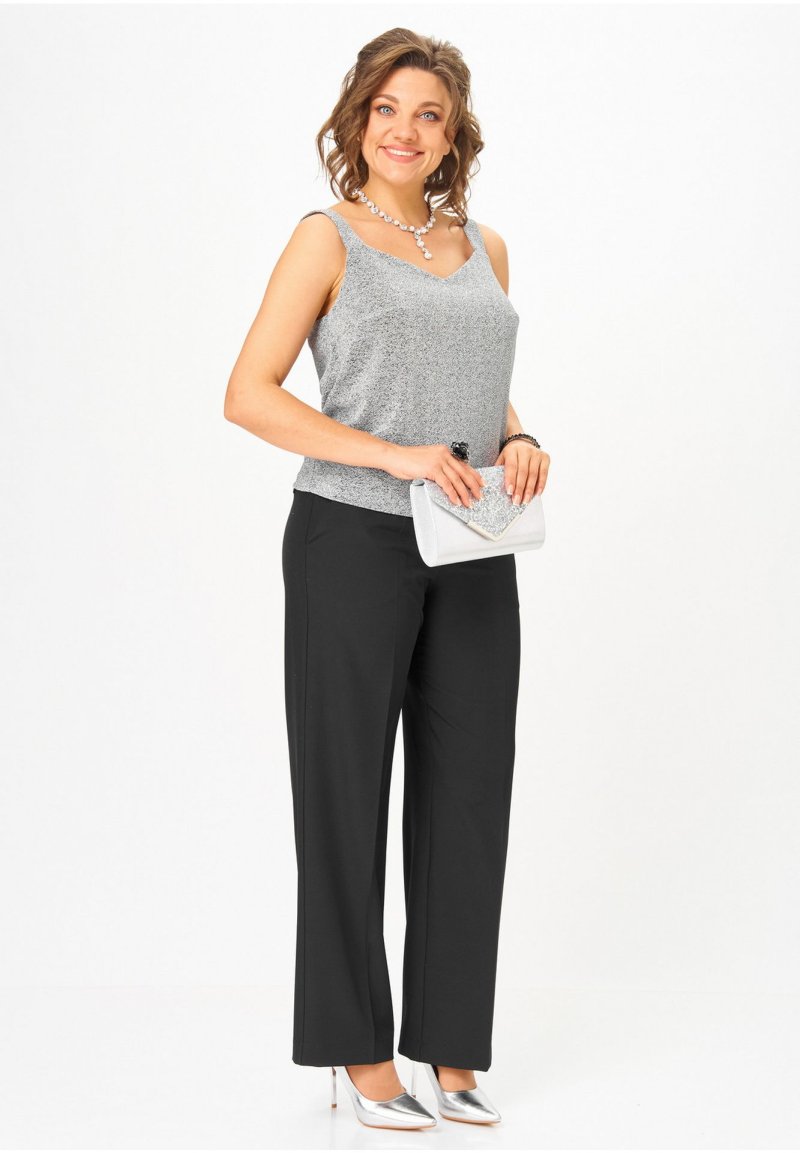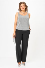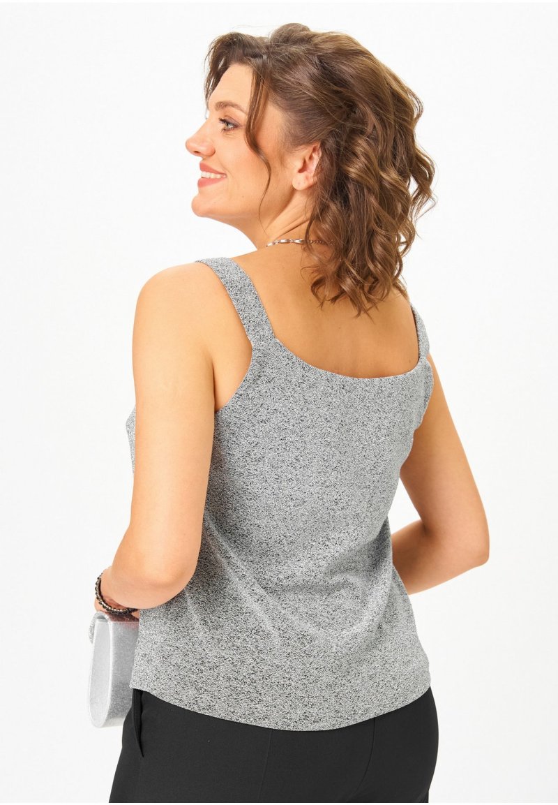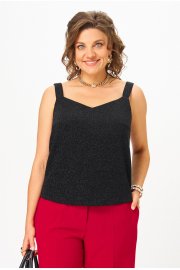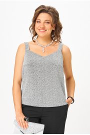 Топ прямого силуэта на широких бретелях, выполнен из трикотажного полотна с люрексом. Перед с нагрудными вытачками. Горловина переда лёгкой V-образной формы. Спинка цельнокроеная.