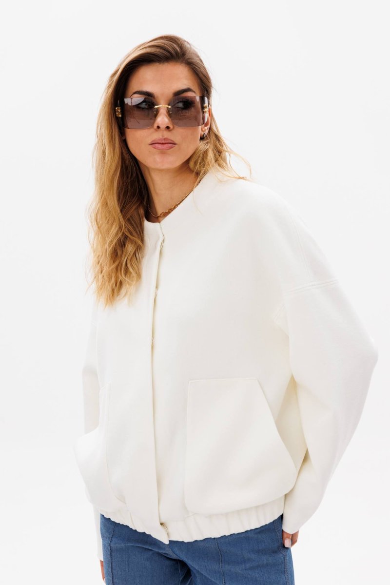 Куртка женская из тёплой ткани, объёмная, по низу на поясе с эластичной тесьмой, рукав широкий на спущенной пройме, воротник стойка, по переду изделия накладные карманы, застёжка спереди на кнопки. Изделие на паодкладке.