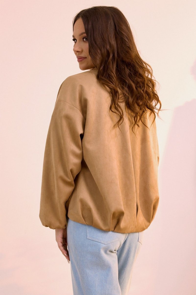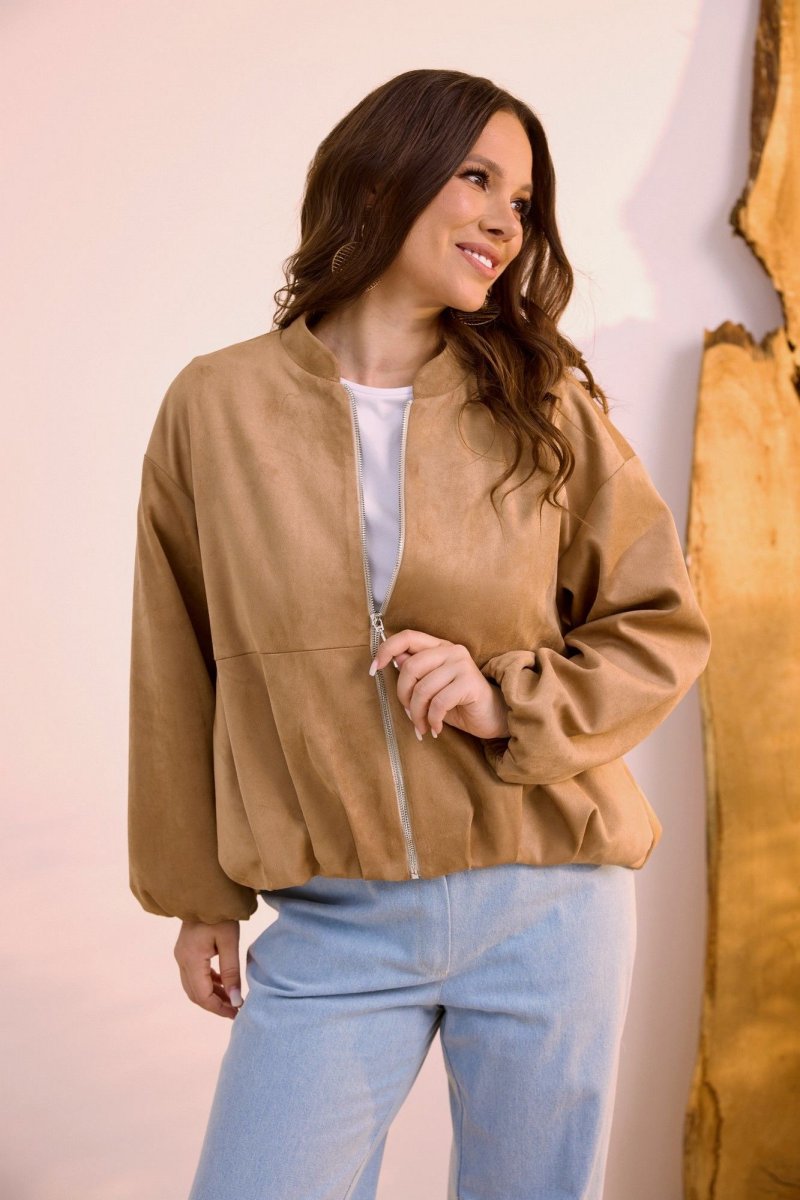 Стильная замшевая куртка в ТОПовом оттенке, которая так популярна в этом сезоне. Выполнена из текстильной замши премиум качества на подкладке без утеплителя. Можно использовать как бомбер и носить под верхнюю одежду. Куртка с центральной застежкой на металлическую молнию. Горловина обработана стойкой. Рукав втачной, слегка спущен. Перед куртки короче спинки. Куртка дополнена боковыми карманами. Длина куртки от плечевого шва по переду 60см., по спинке 66см. Длина рукава 61см.