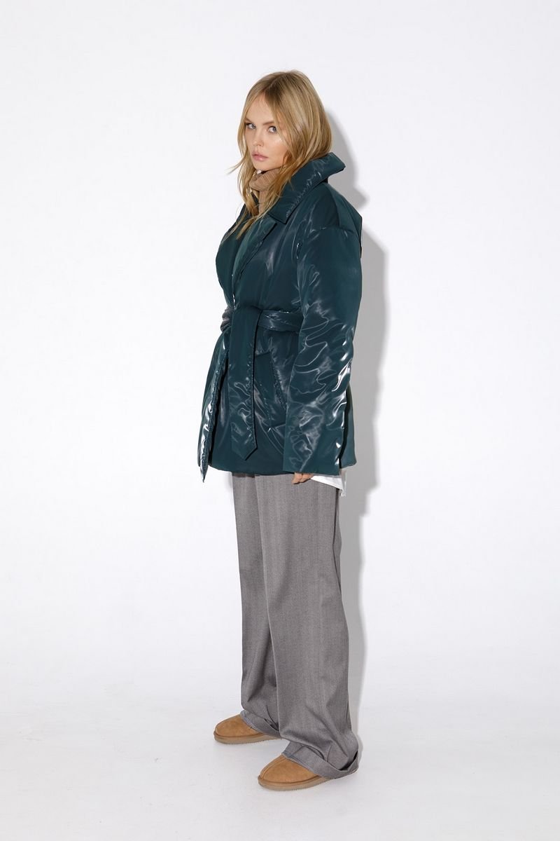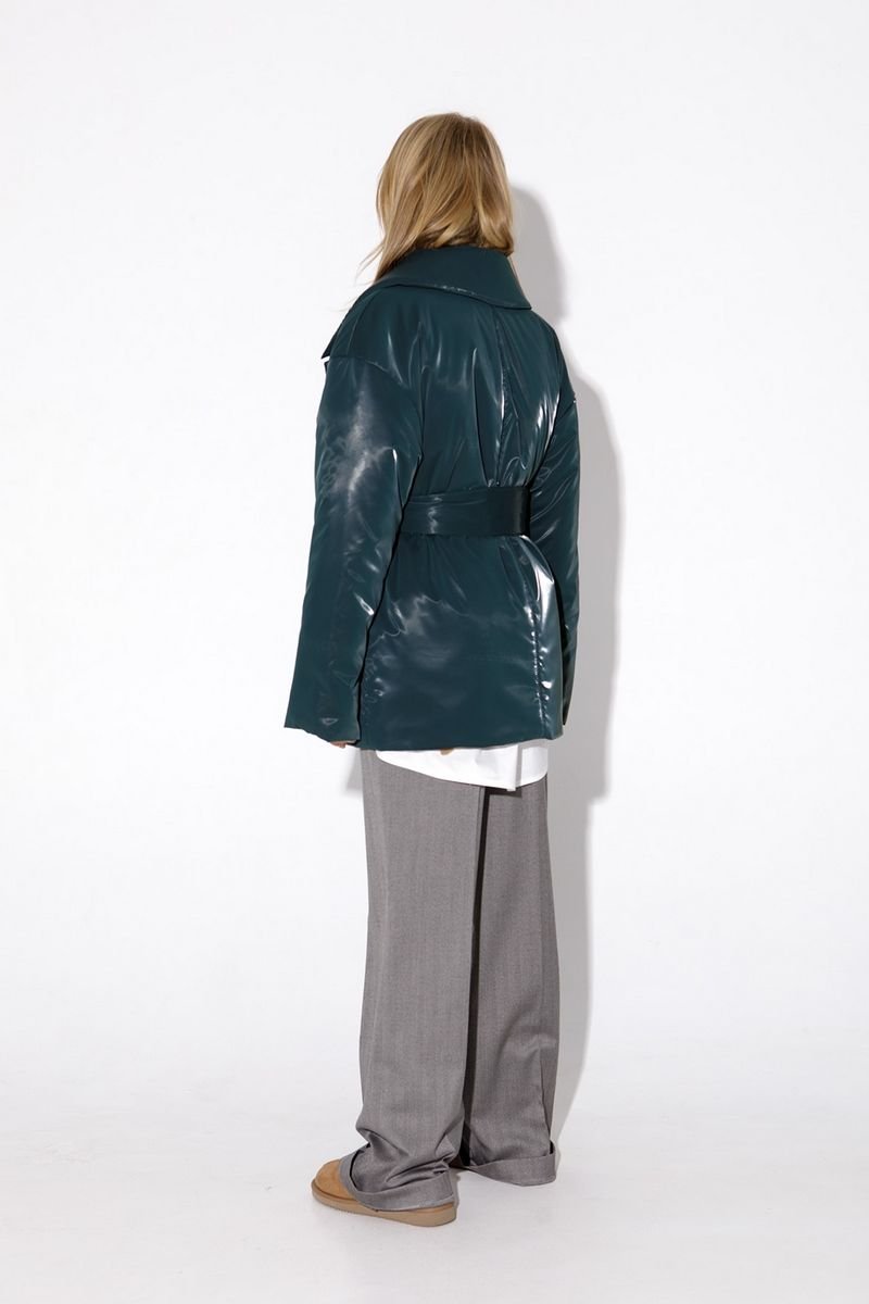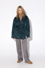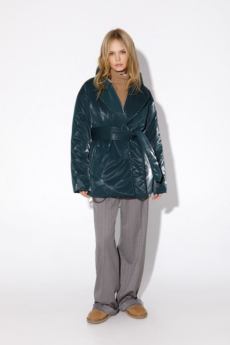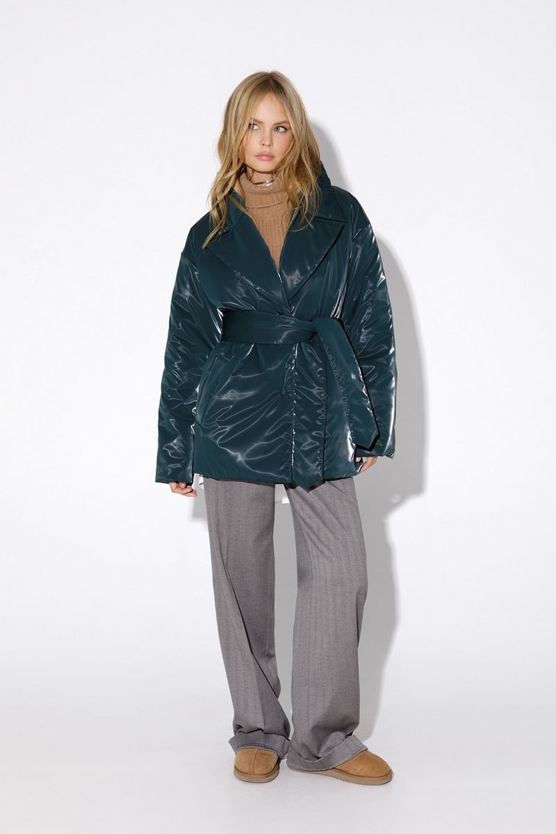 Утепленная куртка свободного покроя из плащевой водонепроницаемой ткани с бархатным эффектом. Детали: полуприлегающий силуэт, пиджачный воротник, спущенная линия плеча, функциональные карманы, застежка на кнопки, рукава длинные, съемный широкий пояс, куртка на подкладке