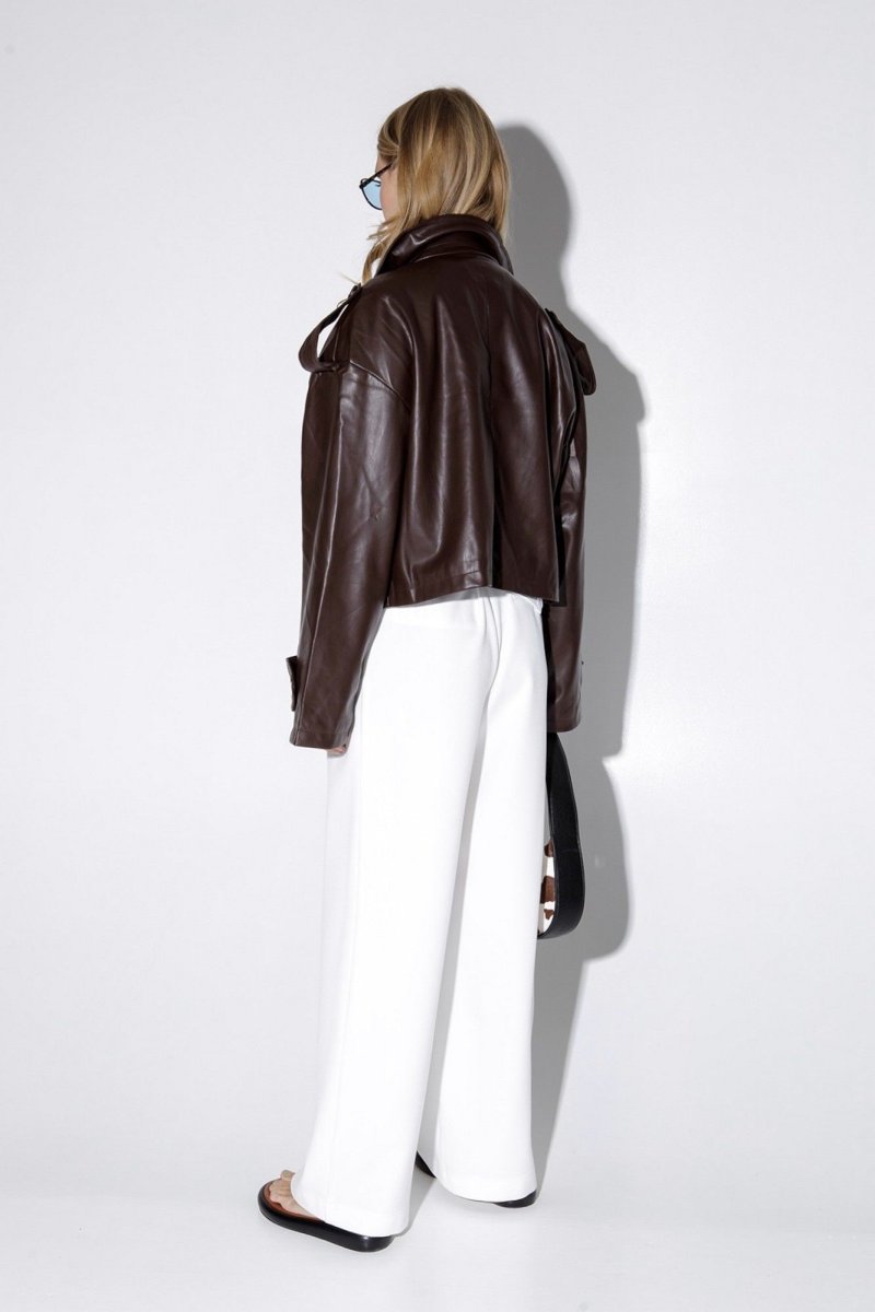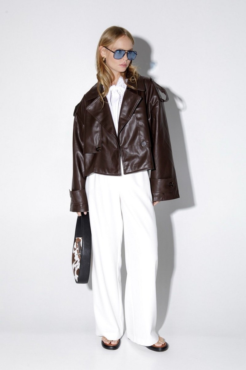 Свободный укороченный тренчкот из экокожи. Детали: спущенная линия плеча, отлетные кокетки переда, застежка на петли и пуговицы, спинка со средним швом, длинные рукава с широкими патами, на подкладке. Длина по спинке около 54,5 см в размерах 40-46 и около 57 см в размерах 48-52, длина рукава+ плечо около 52+10 см.