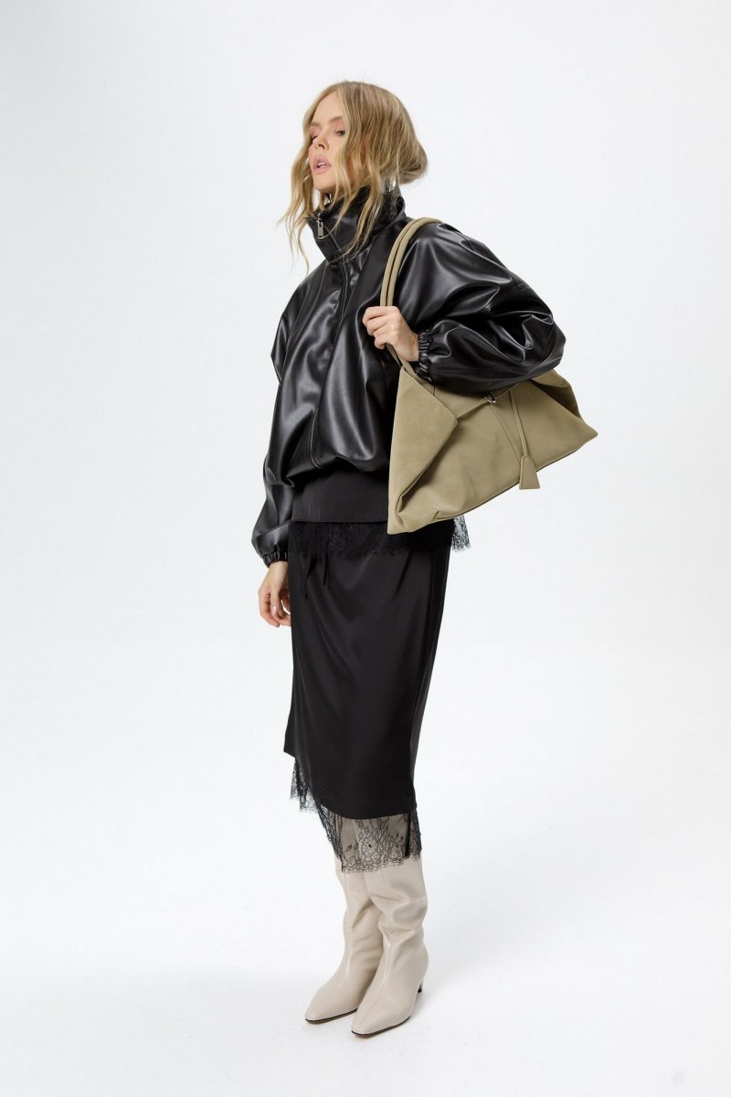 Детали: О-силуэт, расширенное плечо, высокий воротник стойка, пояс бомбера и манжеты на резинке, застёжка на молнию, функциональные карманы, куртка на подкладке.