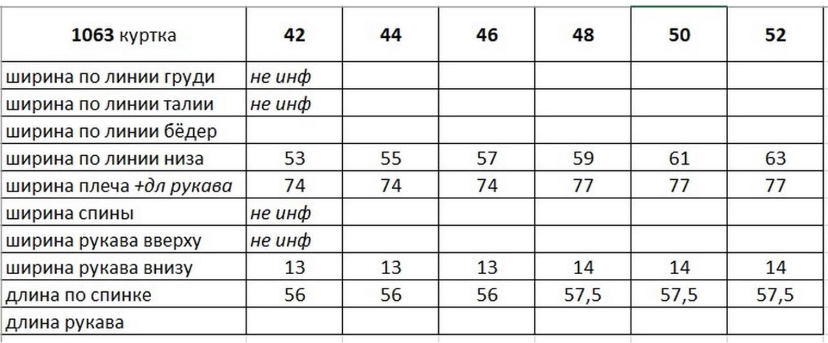 Таблица размеров