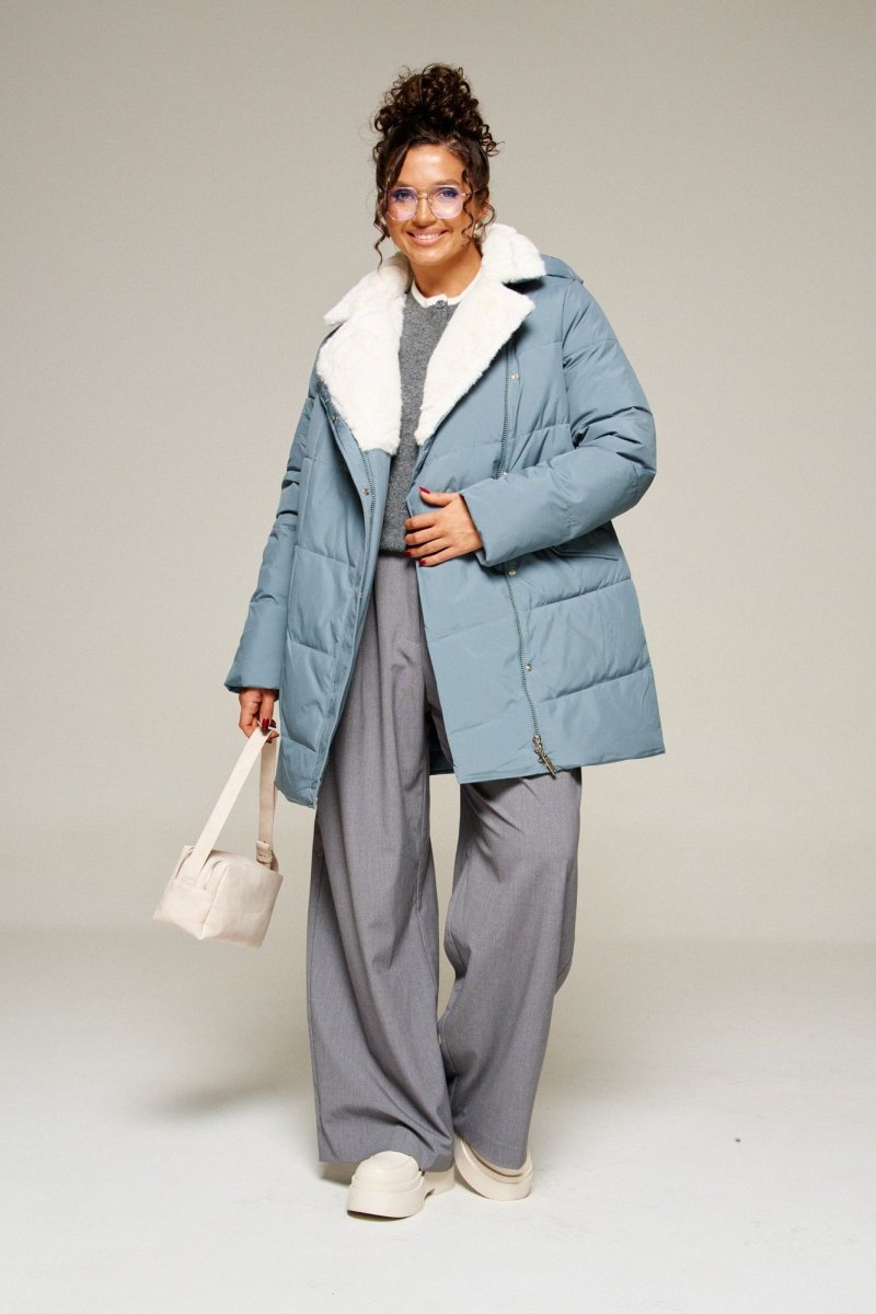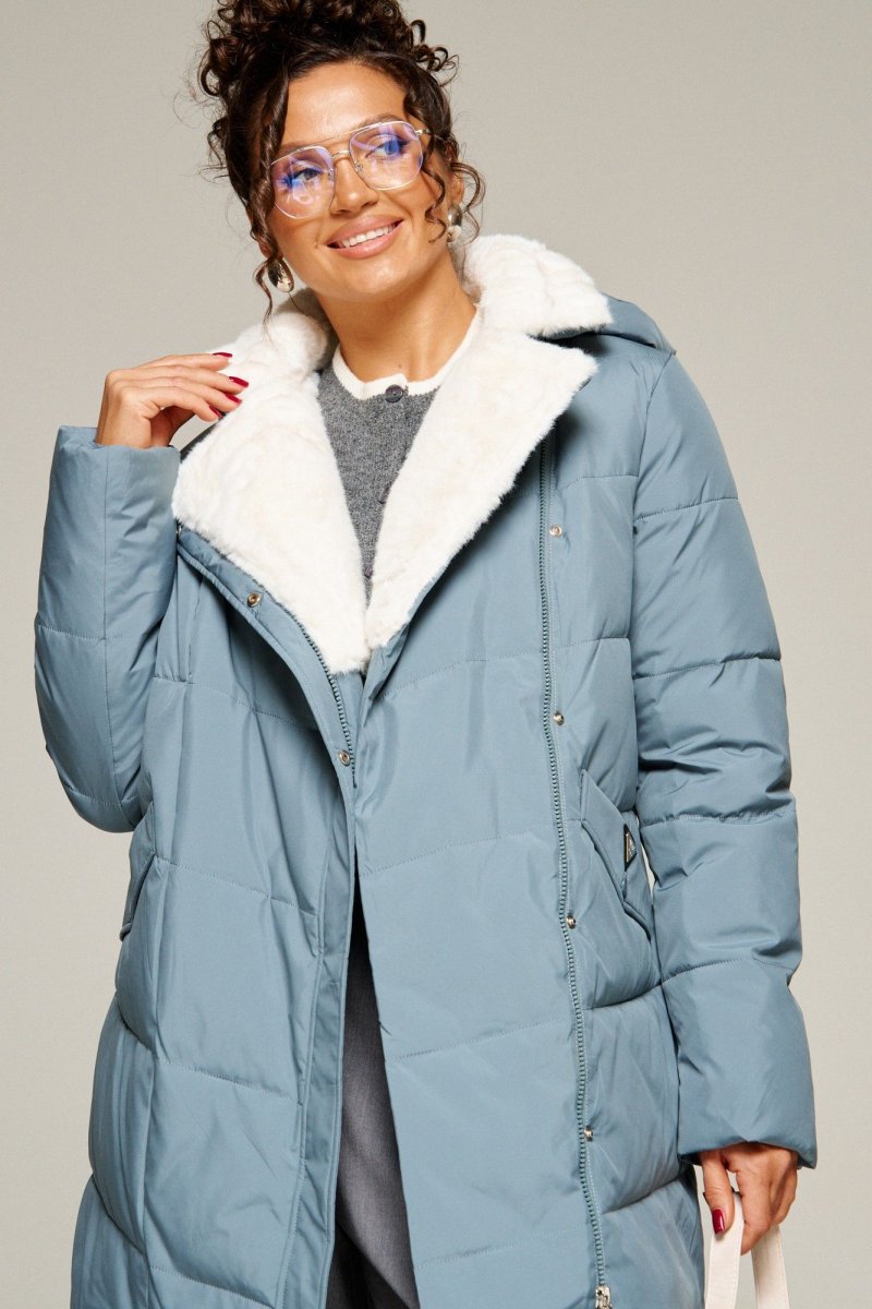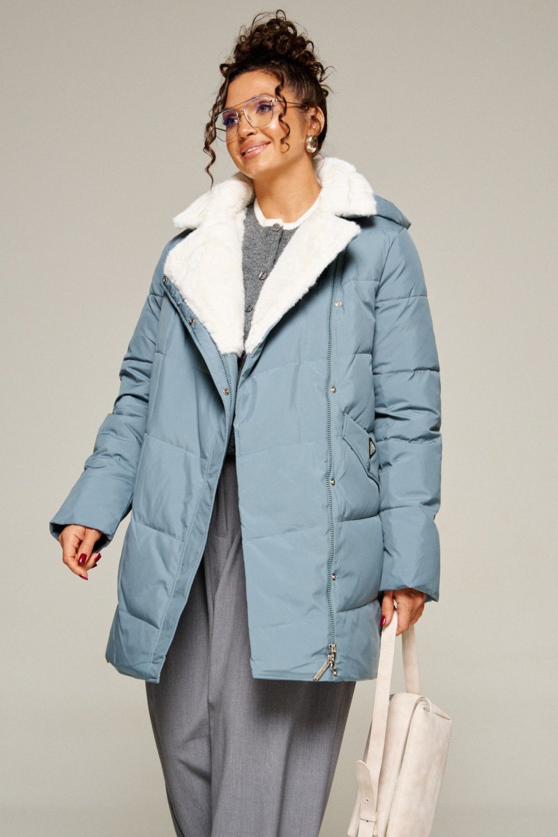 Воротник пиджачного типа с возможностью застегивания до верха. Внутренняя часть воротника и лацканы обработаны искусственным мехом.