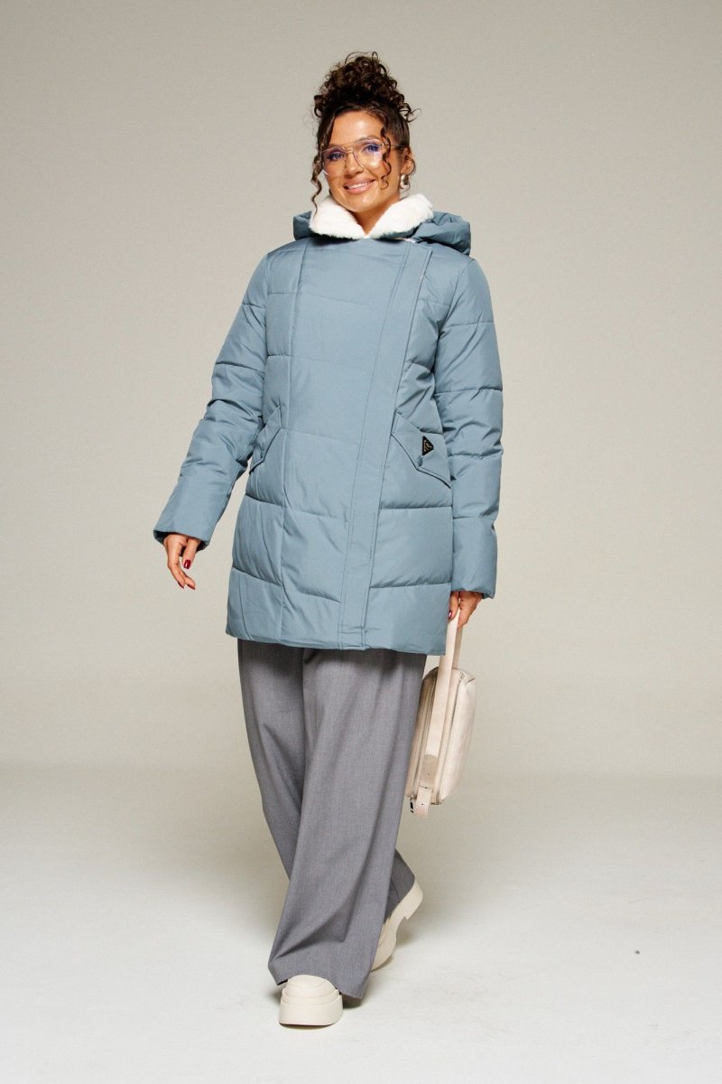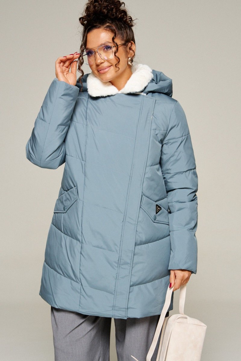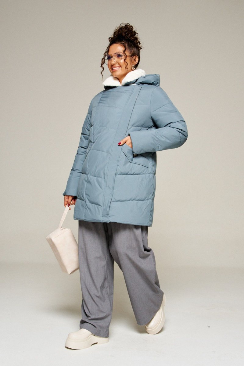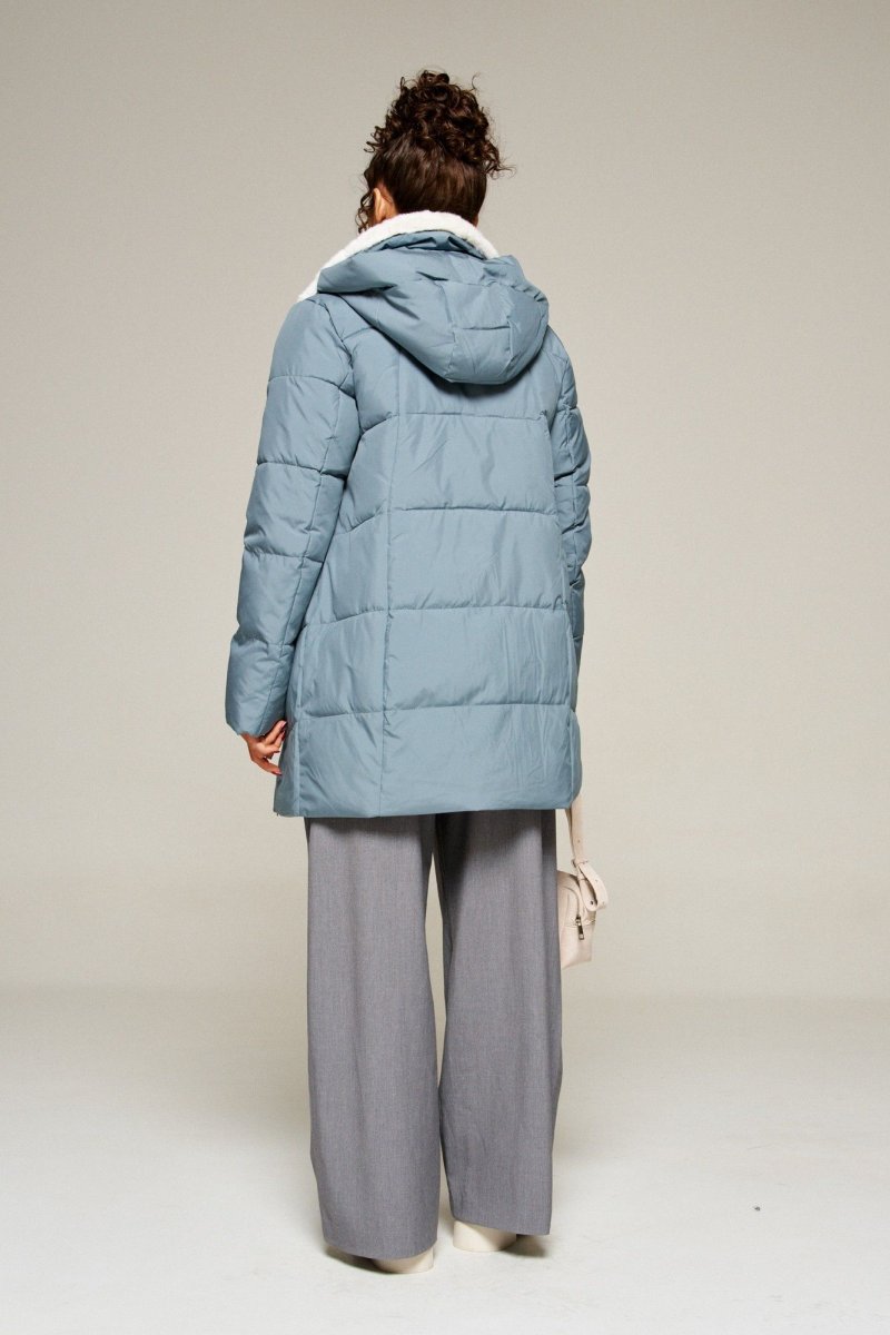 Воротник пиджачного типа с возможностью застегивания до верха. Внутренняя часть воротника и лацканы обработаны искусственным мехом.