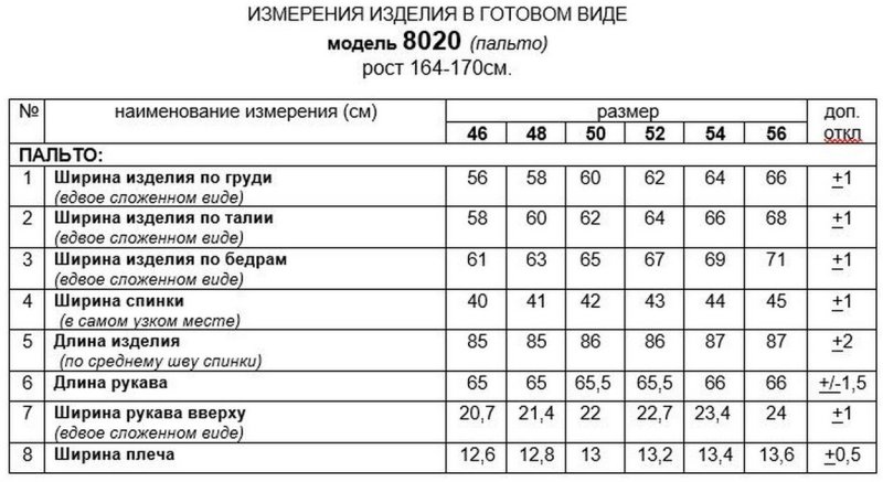 Таблица размеров