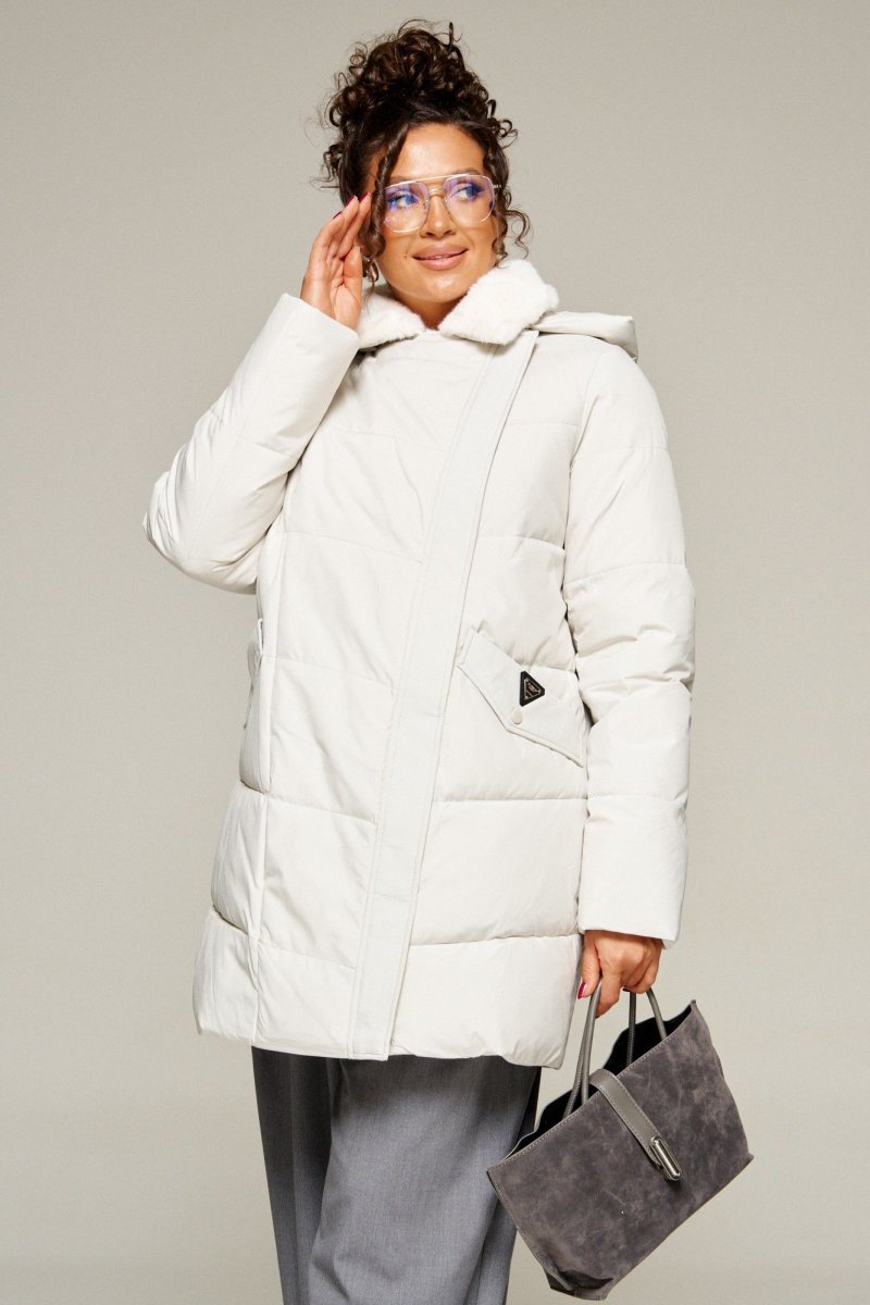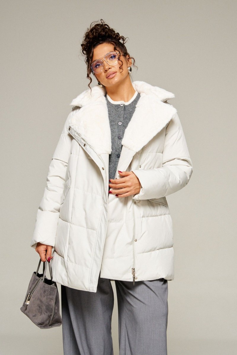 Воротник пиджачного типа с возможностью застегивания до верха. Внутренняя часть воротника и лацканы обработаны искусственным мехом.