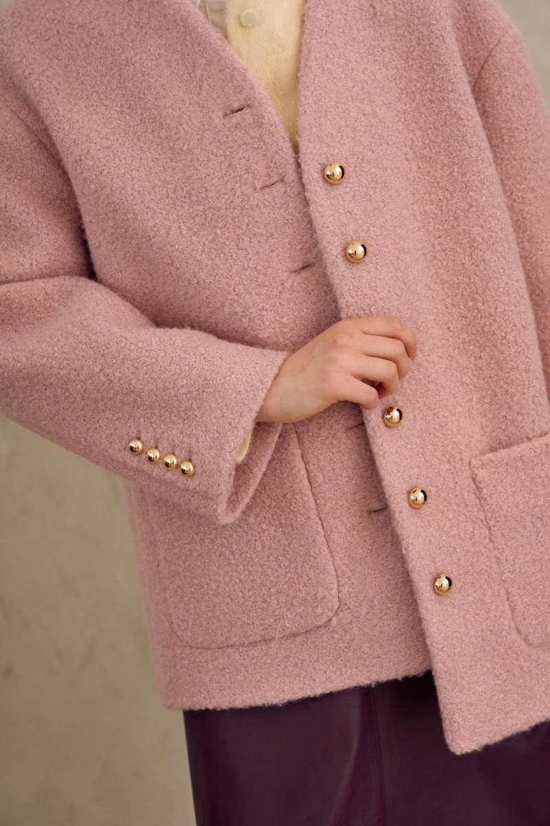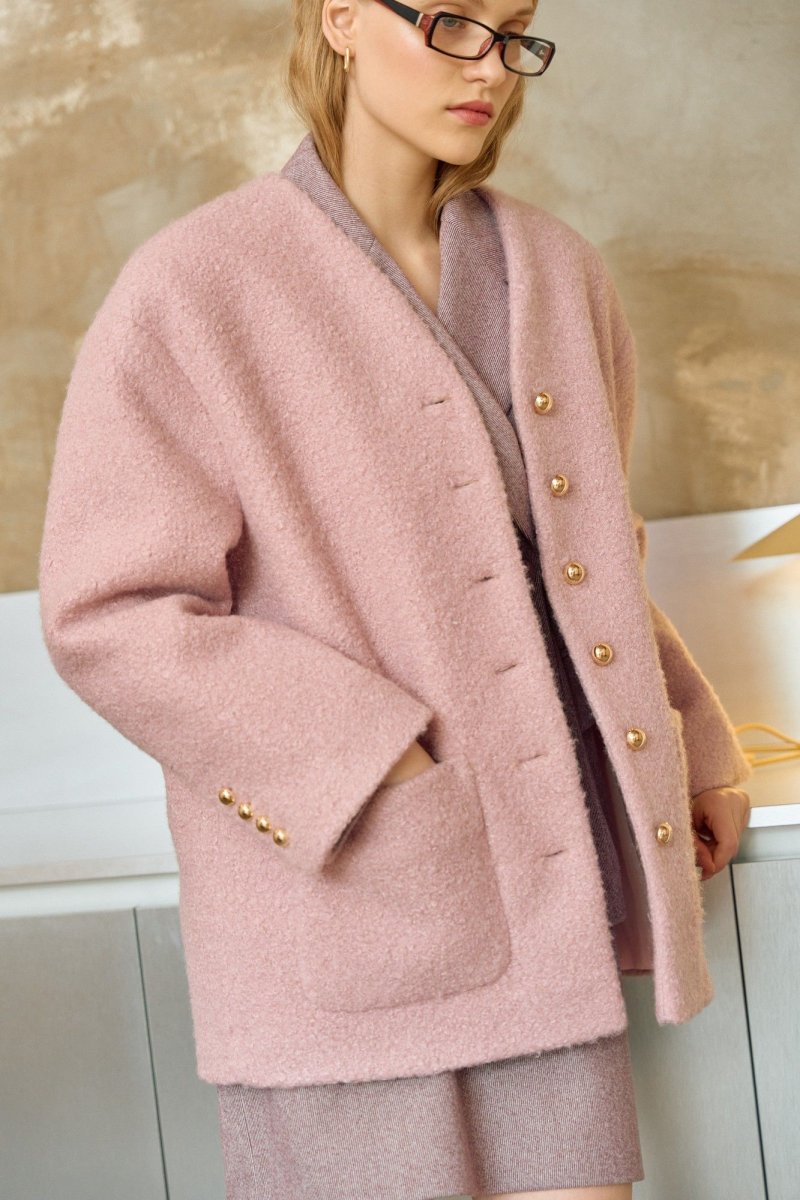 Полупальто свободного кроя, прямого силуэта на подкладке. Линия плеча спущена. Рукав длинный, по шлице рукава пришит ряд металлических пуговиц. Y-образный вырез горловины. Застежка на петли и пуговицы. По переду накладные карманы.