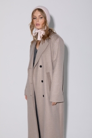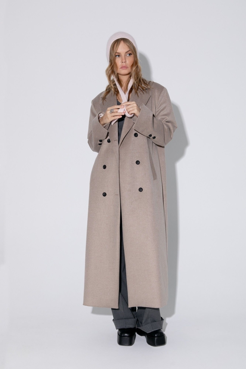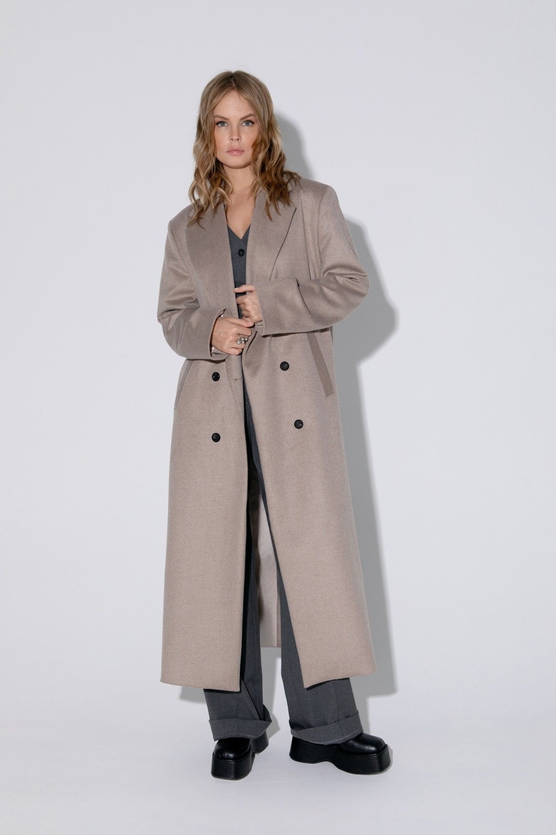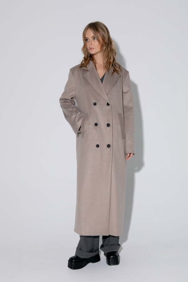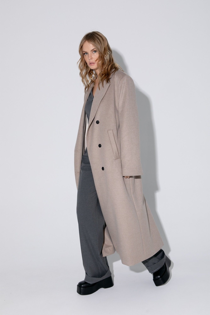 Оверсайз пальто длины миди с расширенным плечевым поясом. Детали: прямой силуэт, свободный покрой, пиджачный воротник, двубортная застежка на петли и пуговицы, рукава втачные со шлицей, функциональные карманы, спинка со средним швом и высокой шлицей, пальто на подкладке. Длина по спинке около 124 см, длина рукава около 61 см