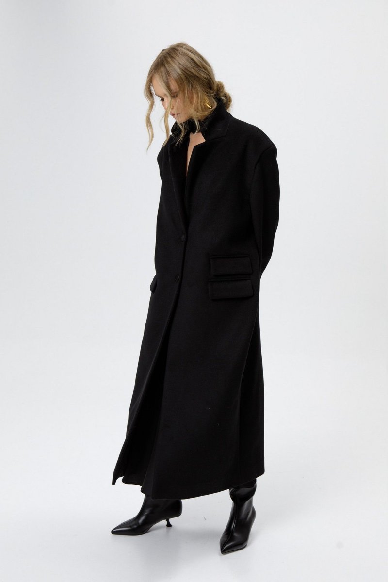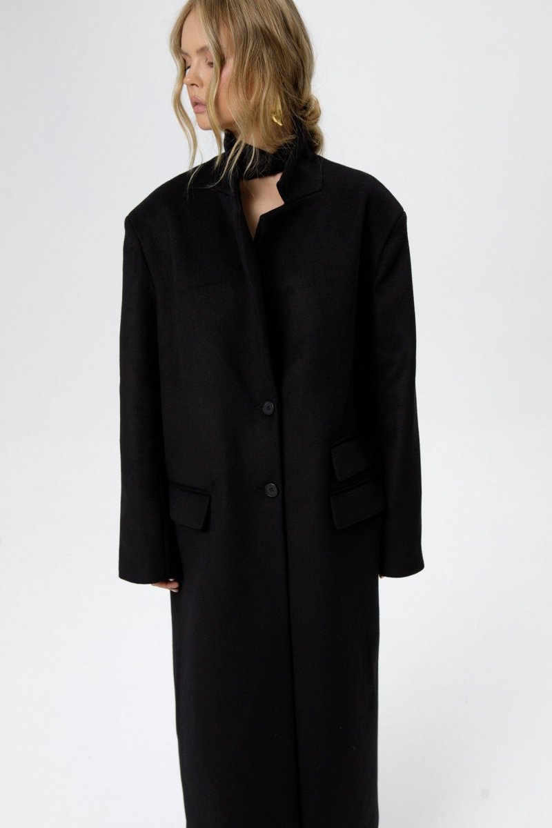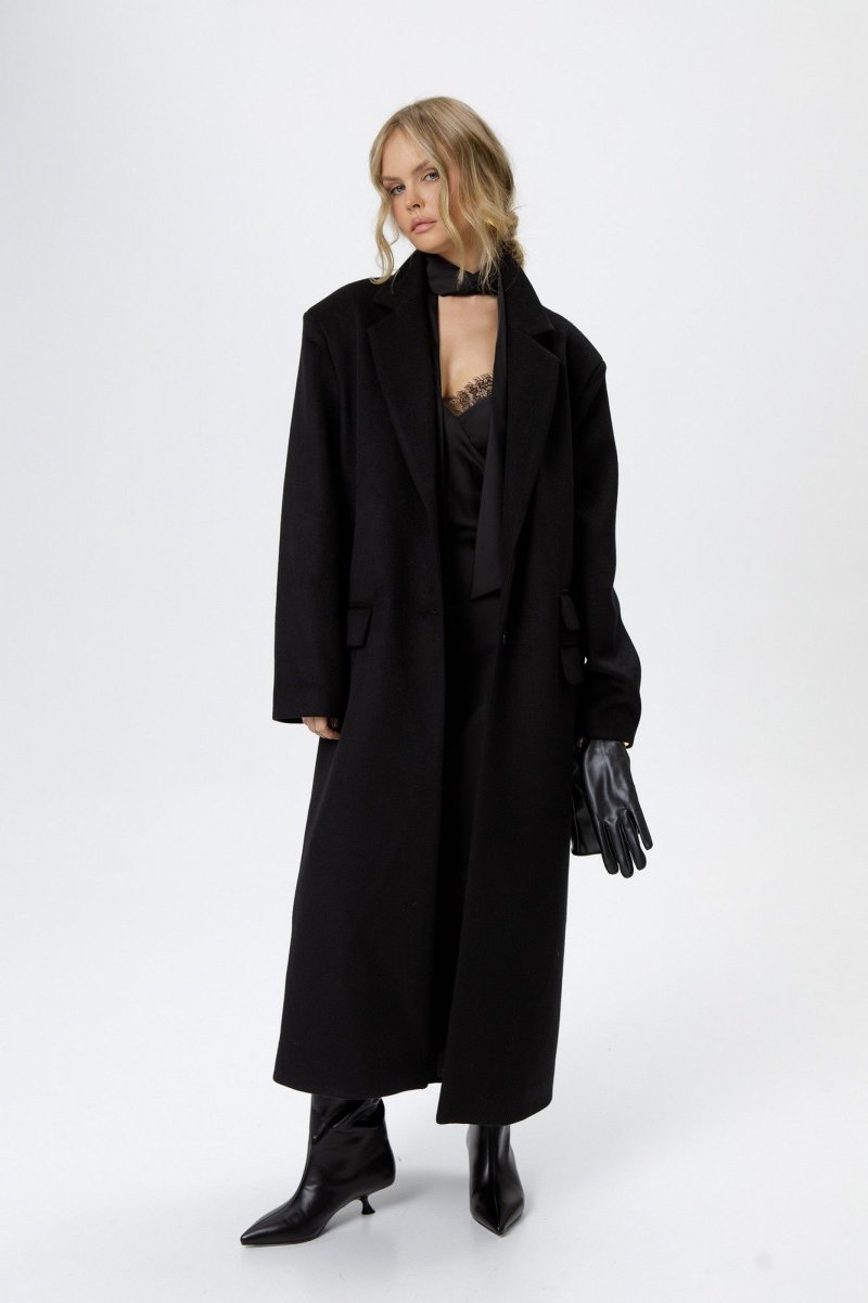 Детали: прямой силуэт, расширенные плечи, пиджачный воротник, застежка однобортная на петли-пуговицы, функциональные карманы, спинка с высокой шлицей, втачные длинные рукава, пальто на подкладке.