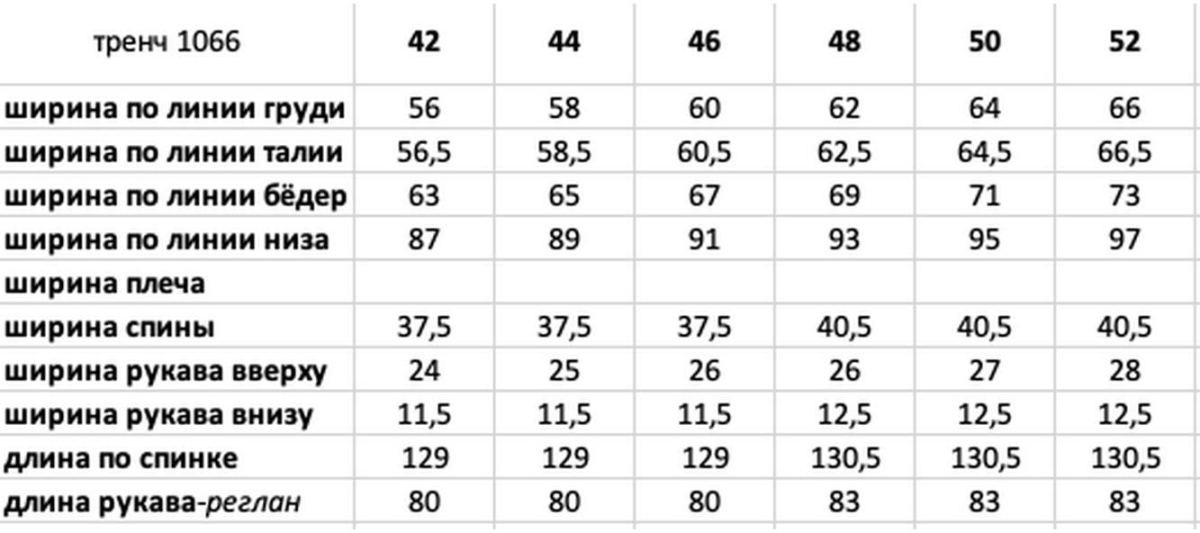 Таблица размеров
