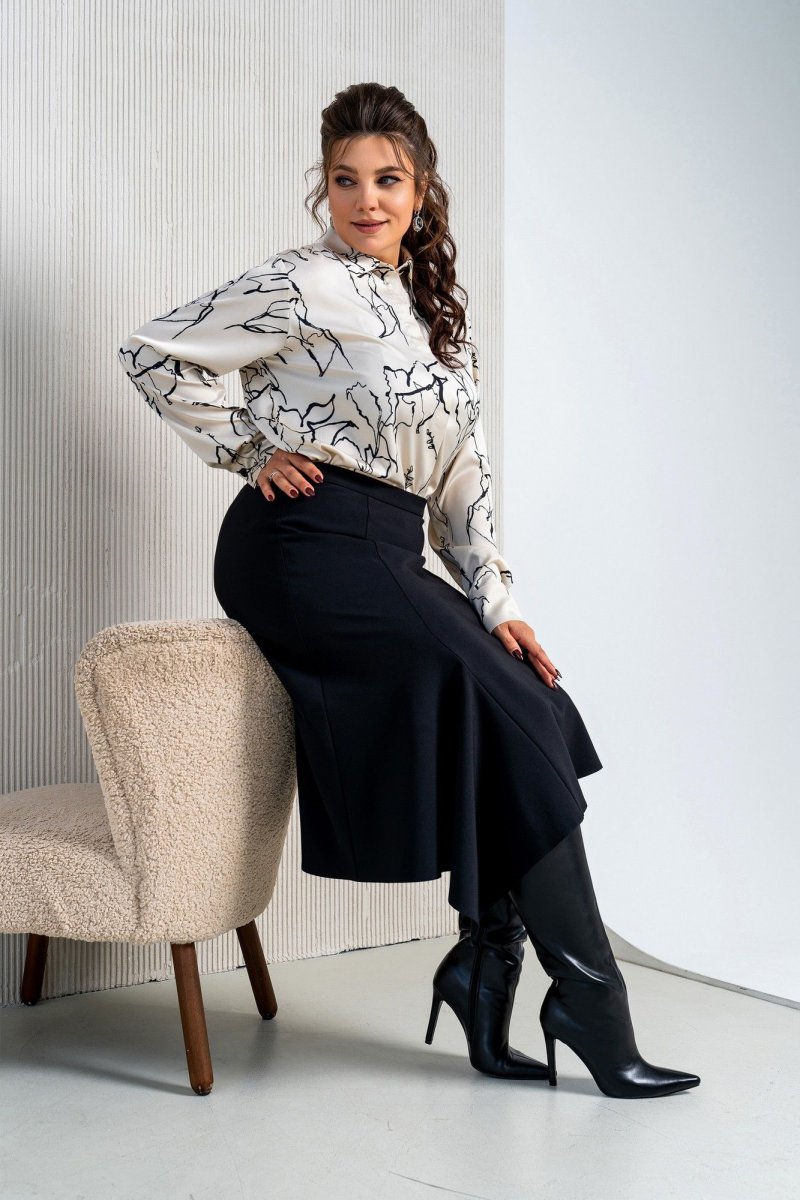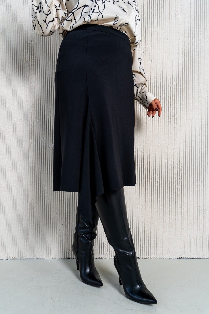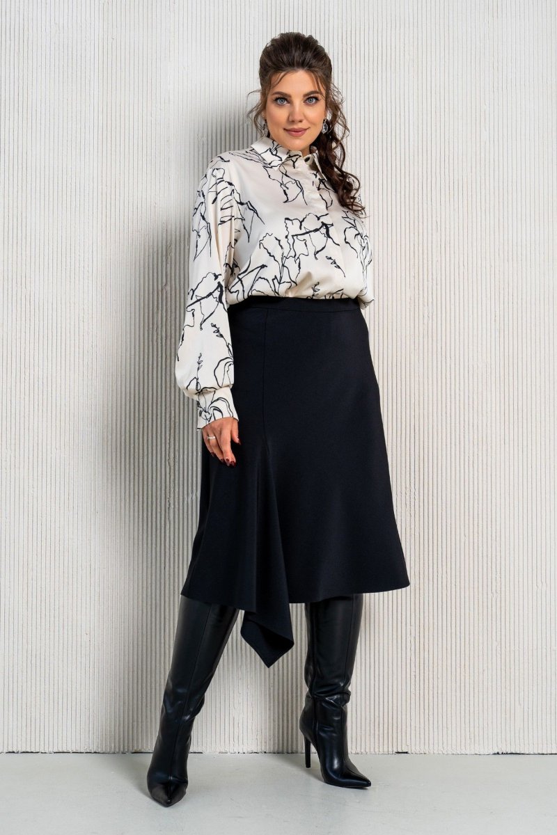 Юбка, которая не подвластная времени с ассиметричной передней частью. Отличный вариант для повседневных и нарядных луков, который можно смело комбинировать с другими вещами. Юбка А-образного силуэта с углом по переду и притачным поясом с эластичной тесьмой по спинке. В боковом шве юбки застёжка на потайную молнию и пуговицу в поясе. Длина юбки 75см