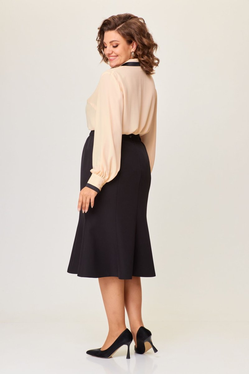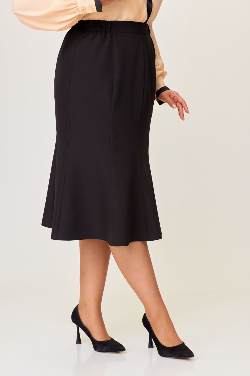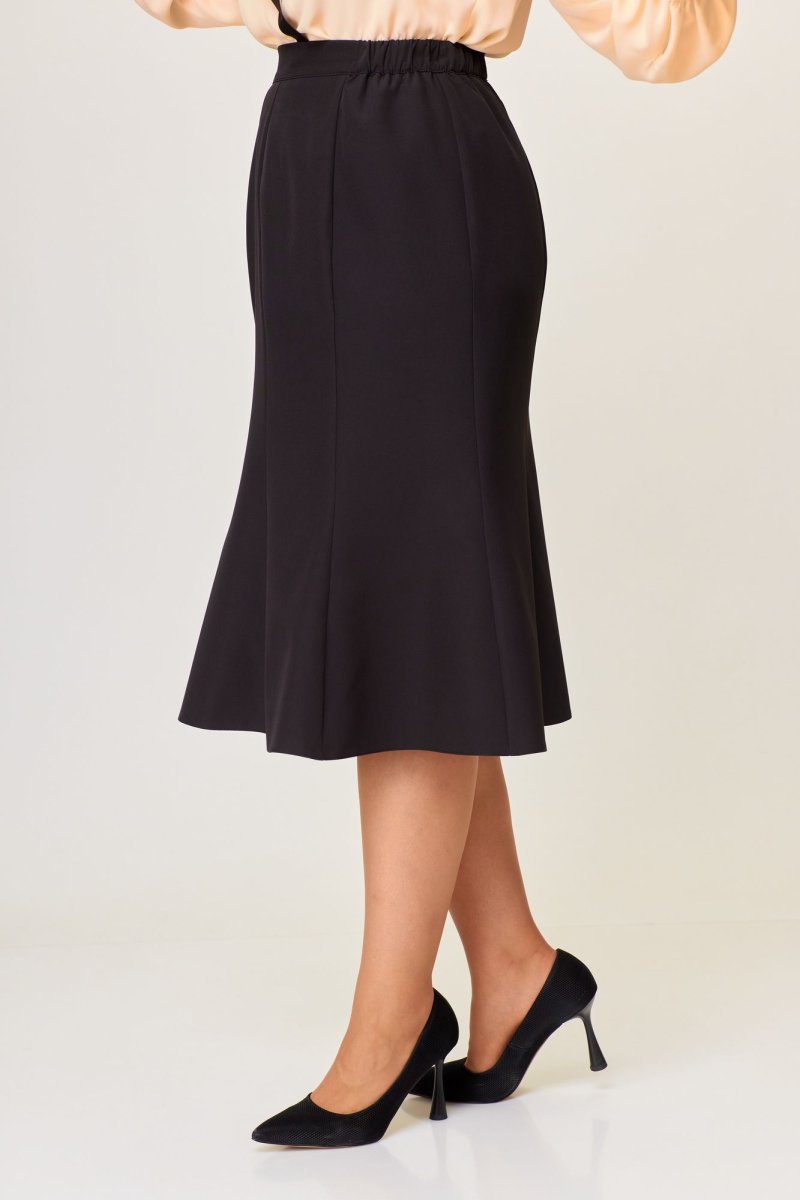 Юбка длиной ниже колена, выполнена из однотонной ткани.