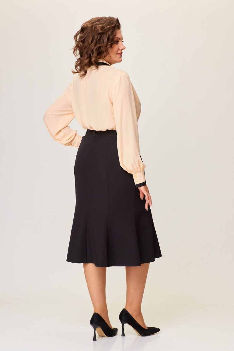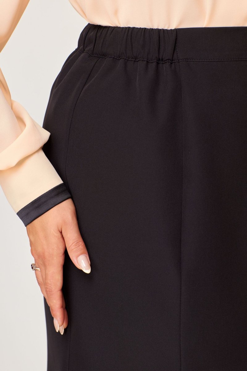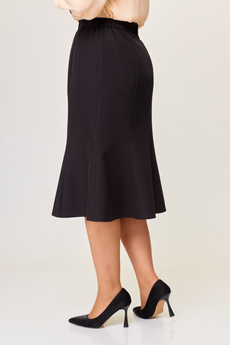 Застежка на потайную молнию выполнена в верхней части среднего шва. По талии юбка на притачном поясе с эластичной тесьмой и застежкой на петлю и пуговицу.