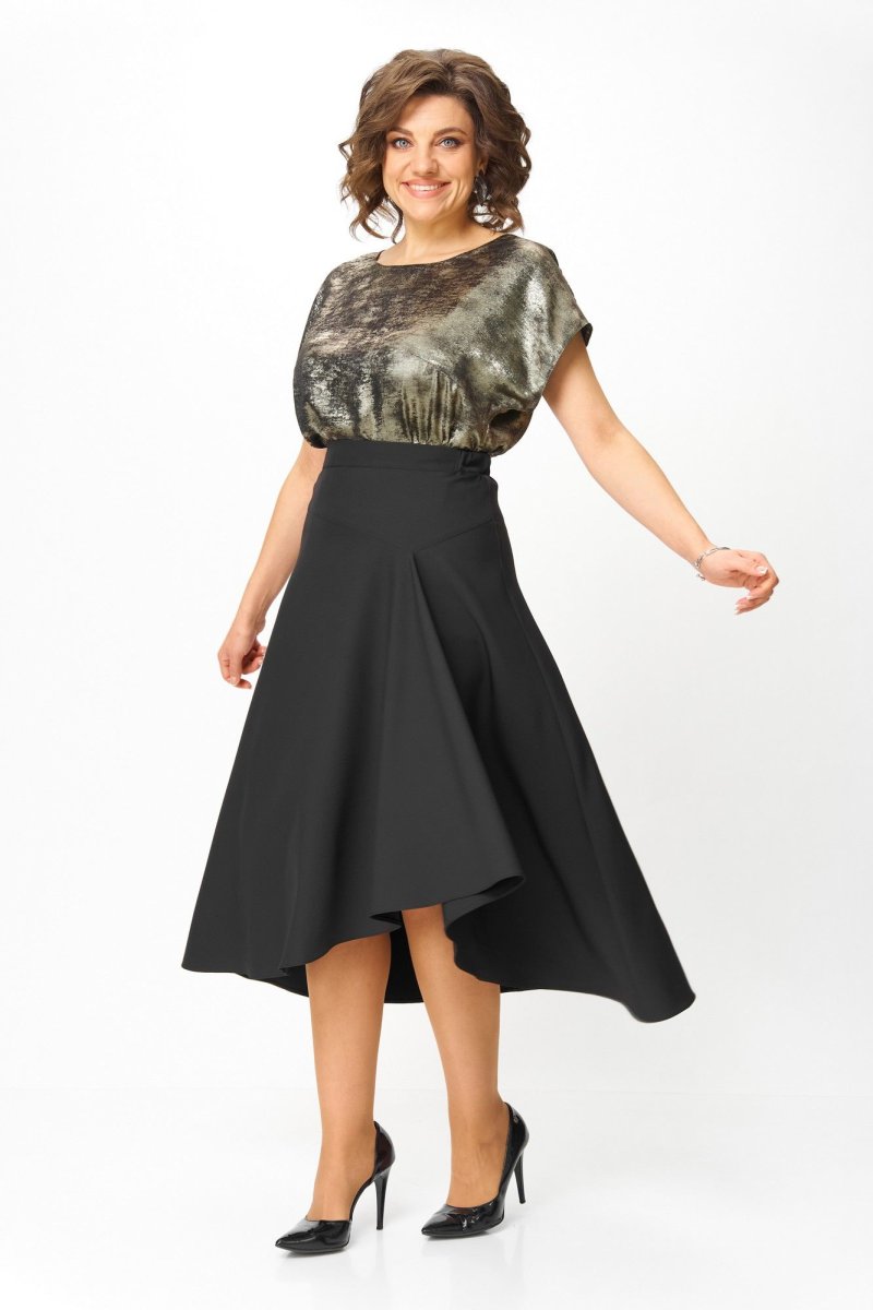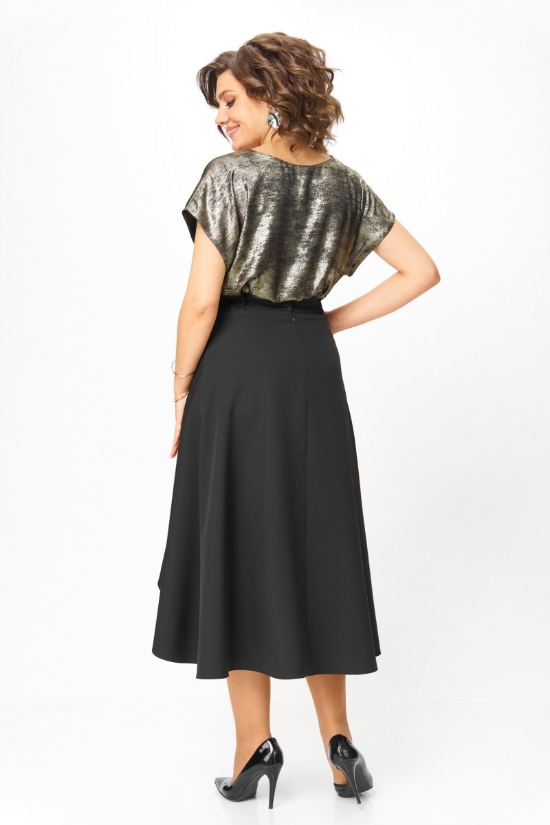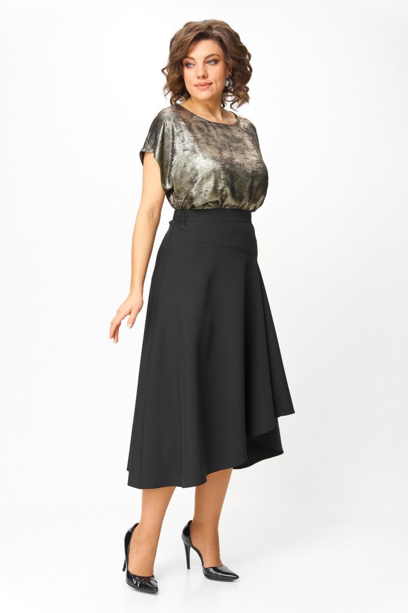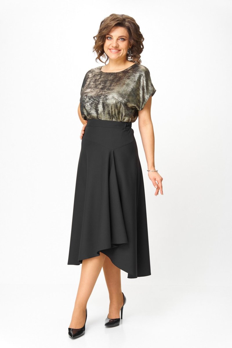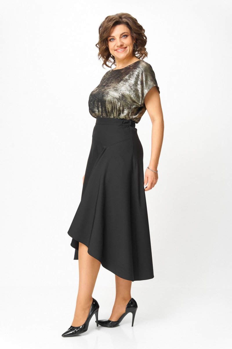 Передняя часть юбки с отрезной кокеткой и конструктивным элементом в виде драпировки и укороченного низа в области левой ноги. Задняя часть юбки со средним швом, в верхней части которго обработана потайная молния. Юбка на притачном поясе, с эластичной тесьмой и застежкой на петлю и пуговицу.