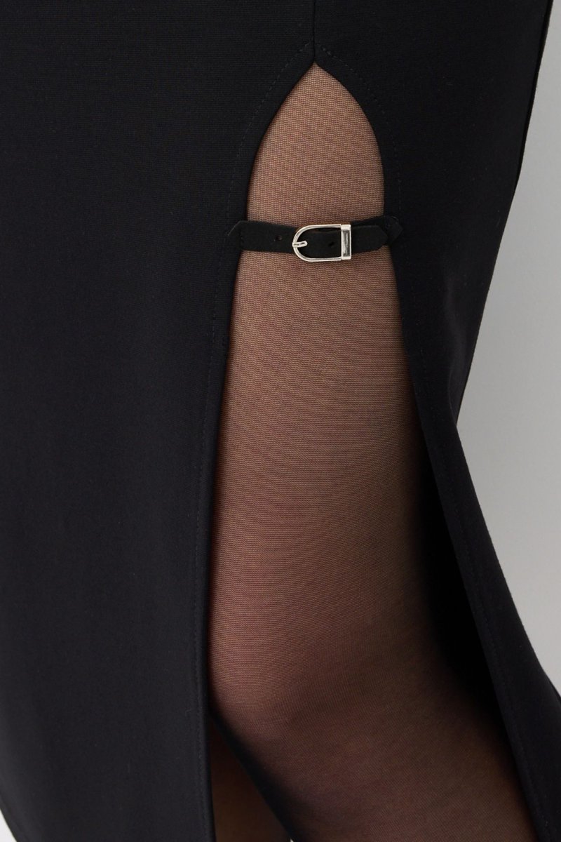 Юбка прямого кроя, пояс притачной на резинке, низ изделия обработан подгибкой. Разрез декорирован пришивной функционально- декоративной металлической пряжкой.