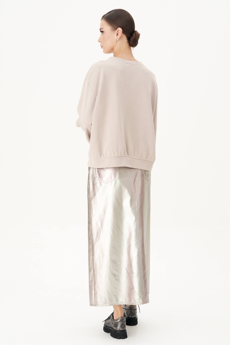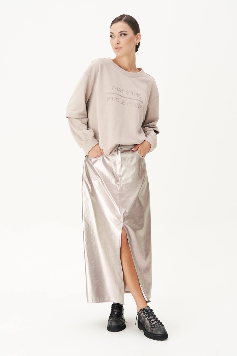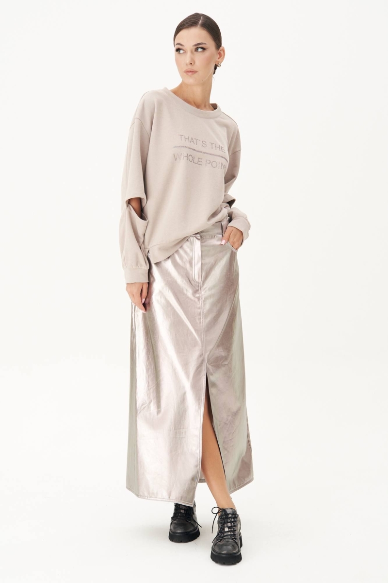 Джинсовая одежда вновь на пике популярности! А всё потому, что деним - универсальный материал, который легко использовать для любого кэжуал силуэта. Но в текущем сезоне мы сделали акцент на фактуре и предлагаем вам интригующее блестящее напыление. Юбка А-силуэта на притачном поясе со шлёвками. Переднее полотнище юбки с центральным швом, застёжкой в нём на молнию и пуговицу, эффектным разрезом и боковыми фигурными карманами. Заднее полотнище юбки с центральным швом, отрезной кокеткой и накладными фигурными карманами. Длина юбки около 90 см.