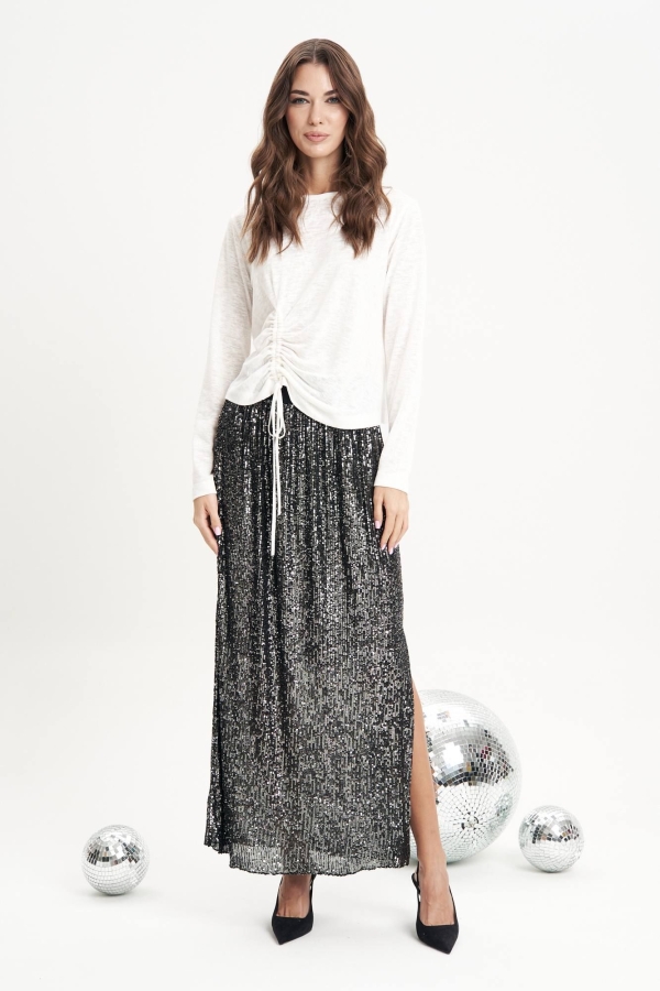 Тренд на металлический блеск в одежде триумфально ворвался в нашу жизнь, а вместе с ним - блестящие юбки макси длины. Чем не повод приобрести для себя такую юбку из трикотажной пайетки. Она, как нельзя лучше, подходит для создания стильного, нарядного образа. Юбка прямая, длинная на эластичном поясе и подкладке. Длина юбки около 90 см.