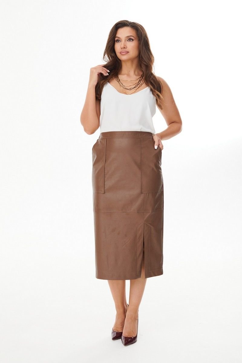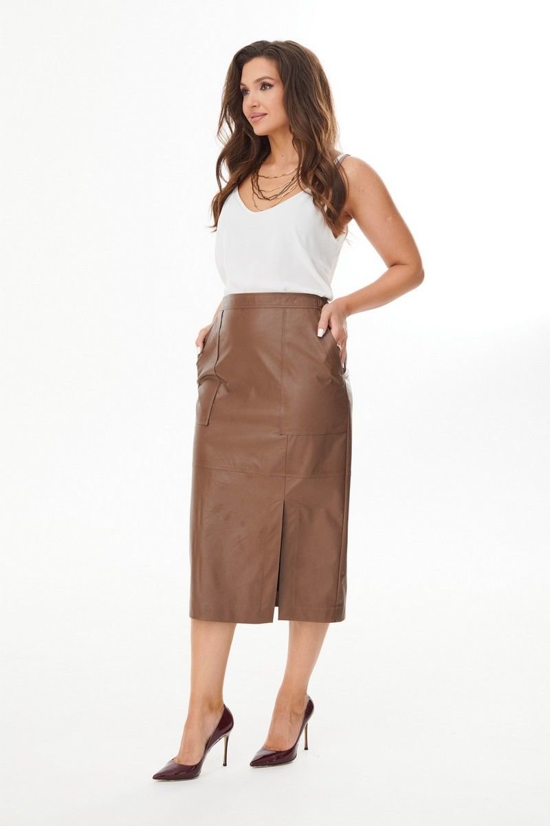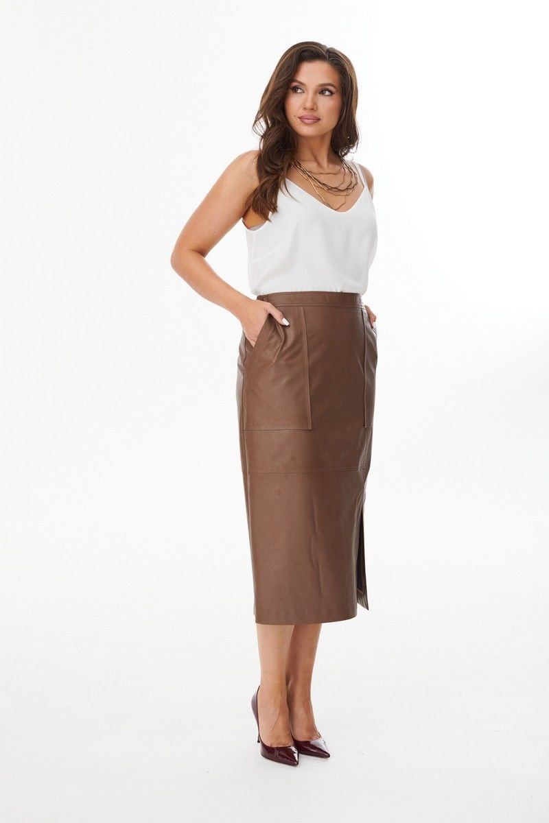Юбка прямого силуэта из экокожи на подкладке. Спереди - горизонтальный рельеф, из рельефа по переду слева разрез. Накладные карманы с косым входом. Пояс прямой сзади на резинке. Сзади застежка - молния.