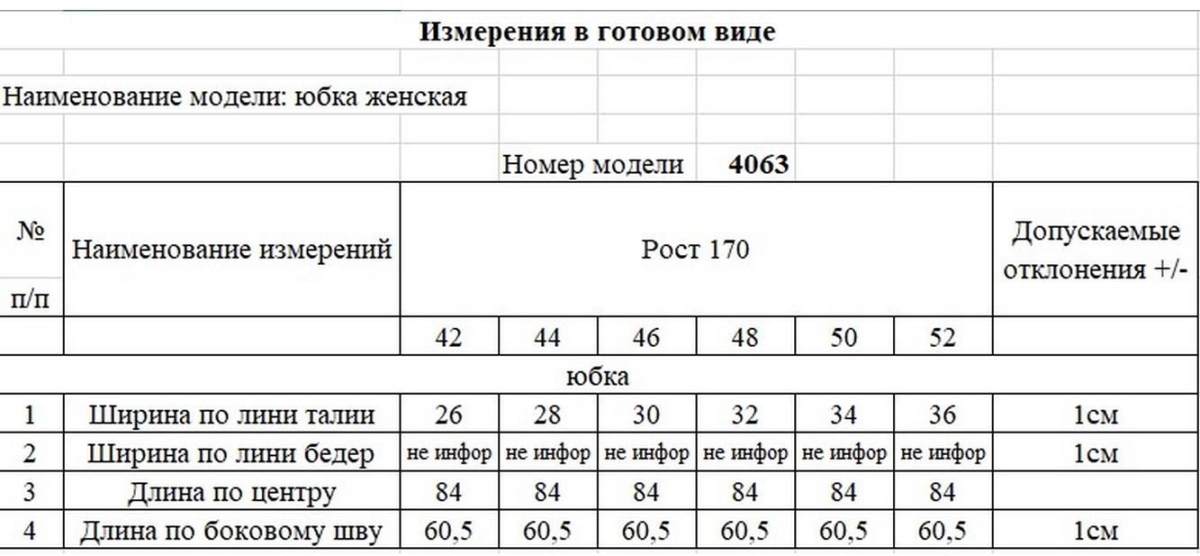 Таблица размеров