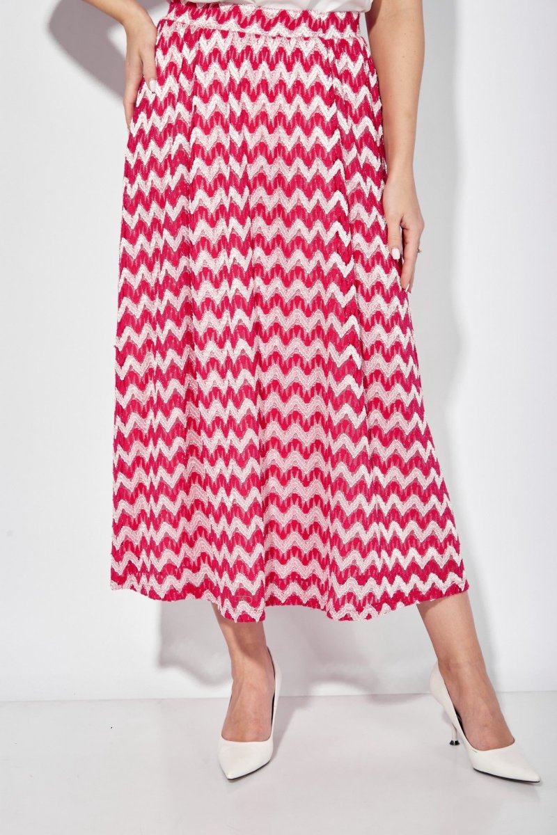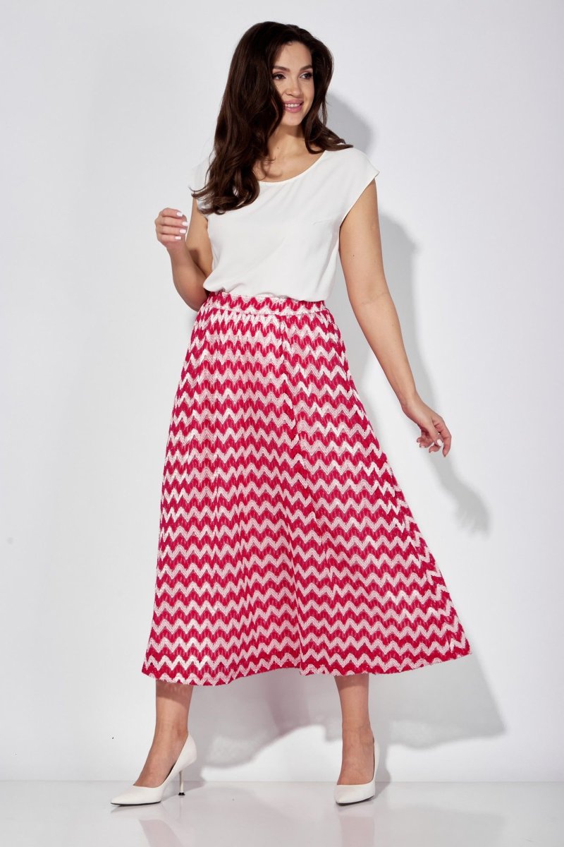 Юбка из трикотажного полотна с рисунком на "сетке". Юбка расширенная к низу, присобрана по талии отрезным поясом с резинкой. Юбка на трикотажной подкладке.