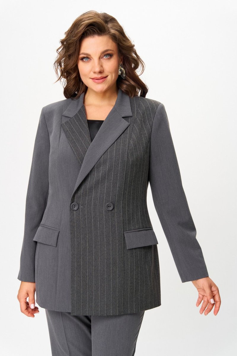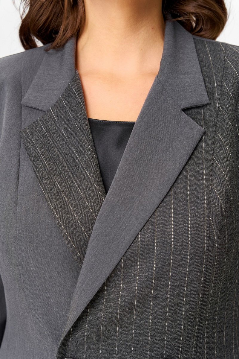 Жакет полуприлегающего силуэта, на подкладке, выполнен из костюмной однотонной ткани, в качестве отделки использована костюмная ткань в полоску.