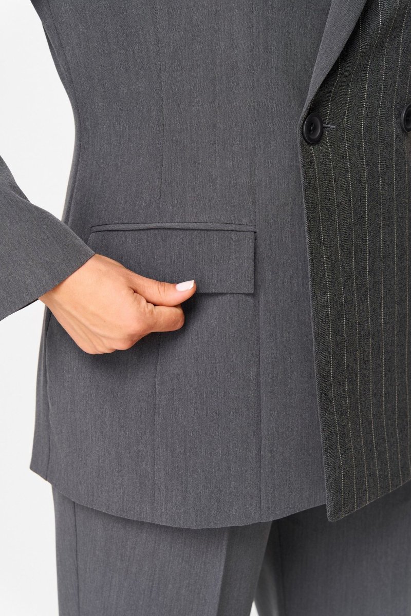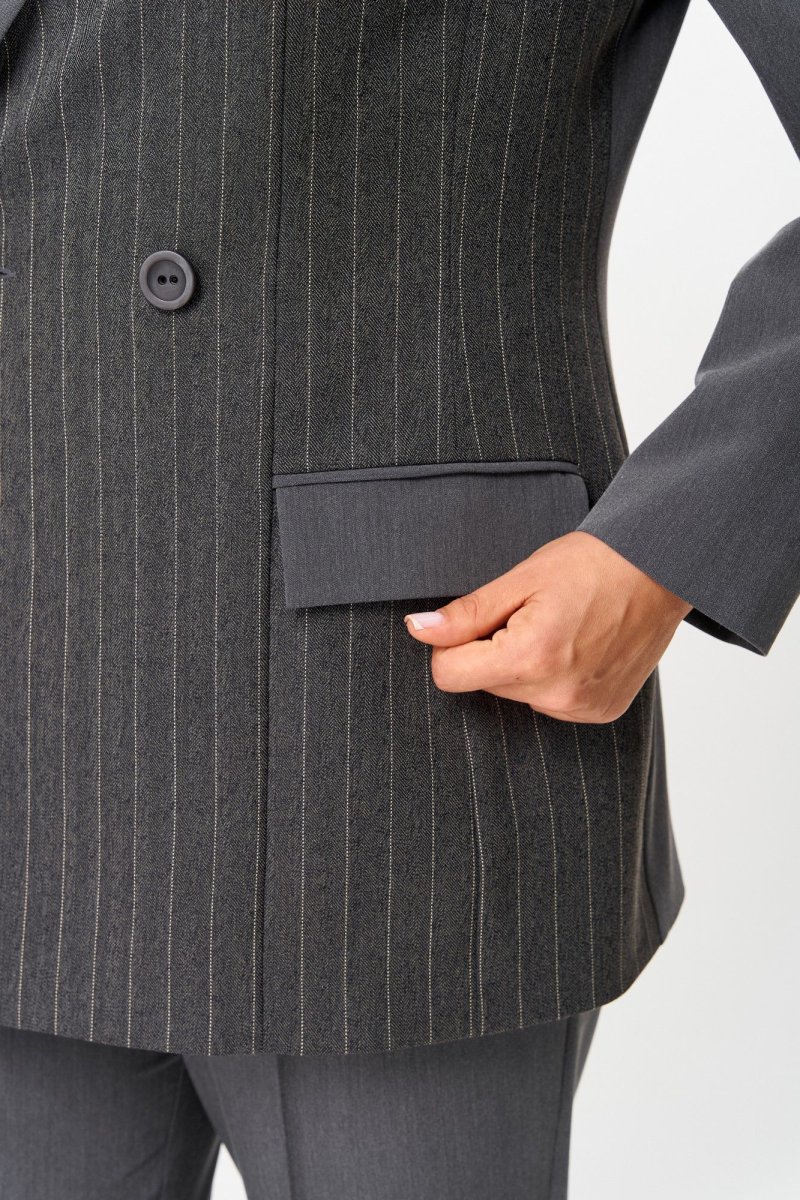 Полочка жакета с двубортной застежкой-трансформер на петли и пуговицы, вертикальными рельефами и прорезным карманом с клапаном. Левая полочка и лацкан правой полочки выполнены из отделочной ткани в полоску. Горловина V-образной формы, с отложными лацканами и воротником пиджачного типа. Спинка со средним швом и вертикальными рельефами. Рукав длинный, двухшовный, втачной.