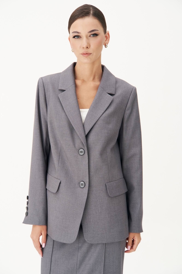 Жакет классического полуприлегающего силуэта, втачного покроя с центральной застёжкой и английским воротником. Полочка с отрезным бочком, талиевой вытачкой и прорезным карманом с клапаном. Спинка с центральным швом, отрезным бочком и плечевой вытачкой. Рукав двухшовный с отлетной шлицей и отделочными пуговицами. Длина жакета около 70 см. Длина рукава около 62 см.