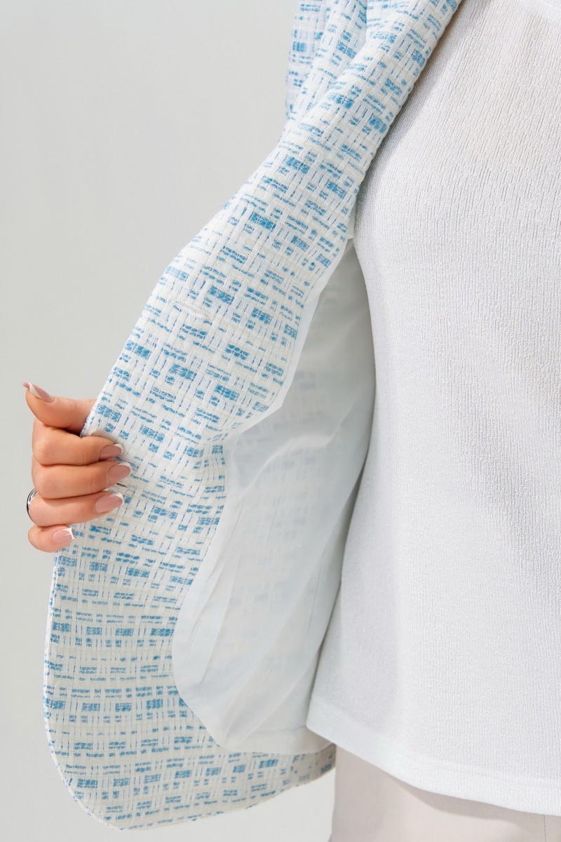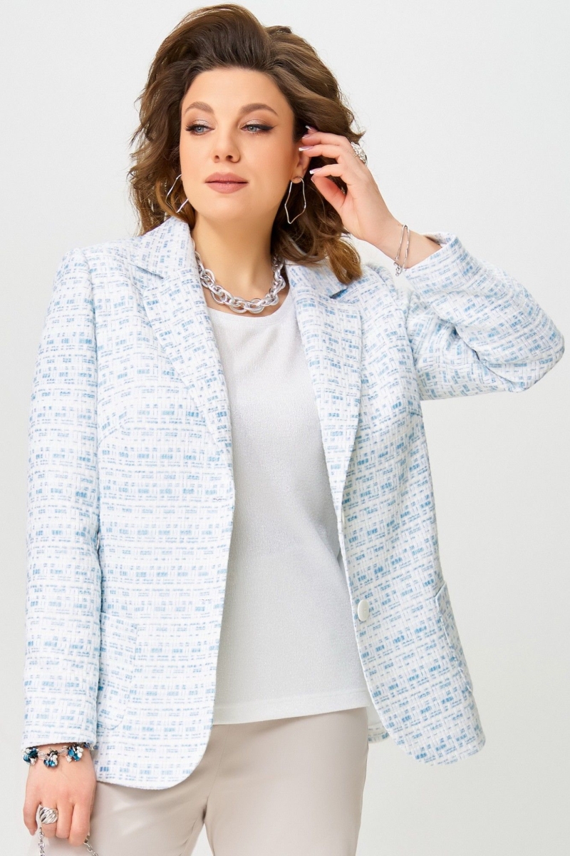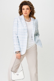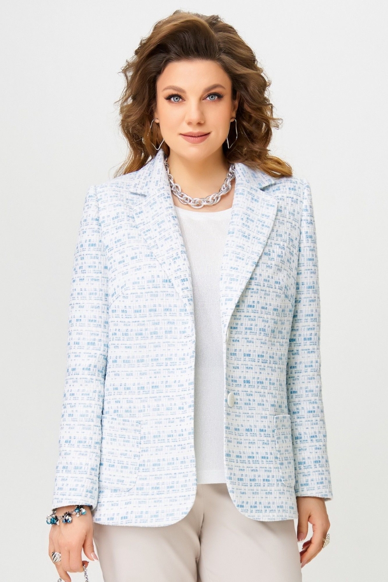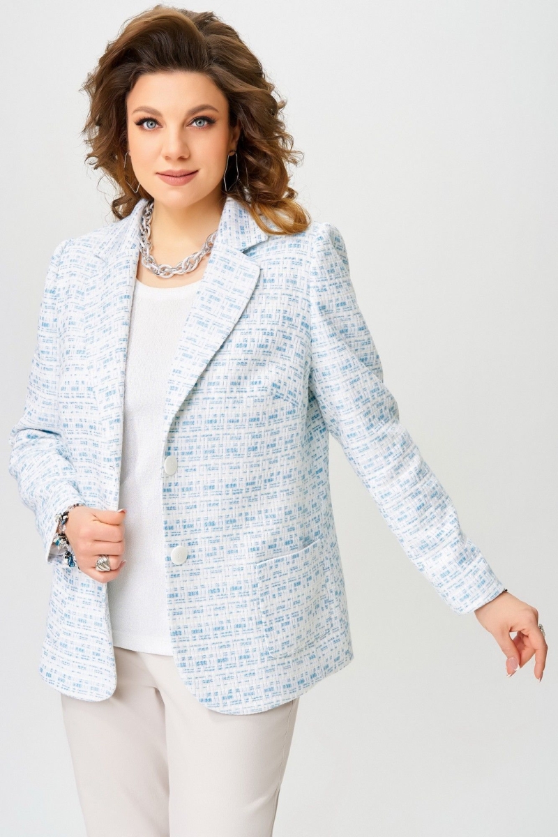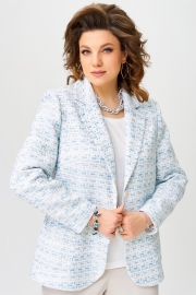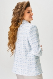 Жакет "Мерея" выполнен из хлопковой плотной ткани, рисунок в виде плетеной корзинки. Жакет на подкладке полуприлегающего силуэта, воротник отложной, по борту лацканы, низ борта закругленный, застежка однобортная на две пуговицы. По полочке - рельеф и накладной карман. По спинке - рельефы, рукав втачной двухшовный. Жакет нарядный отличный вариант для праздников и повседневной носки.