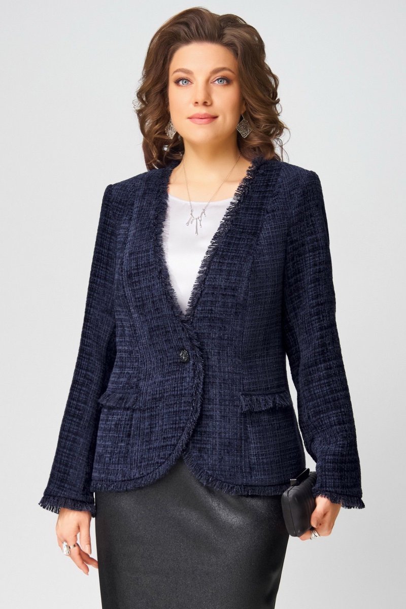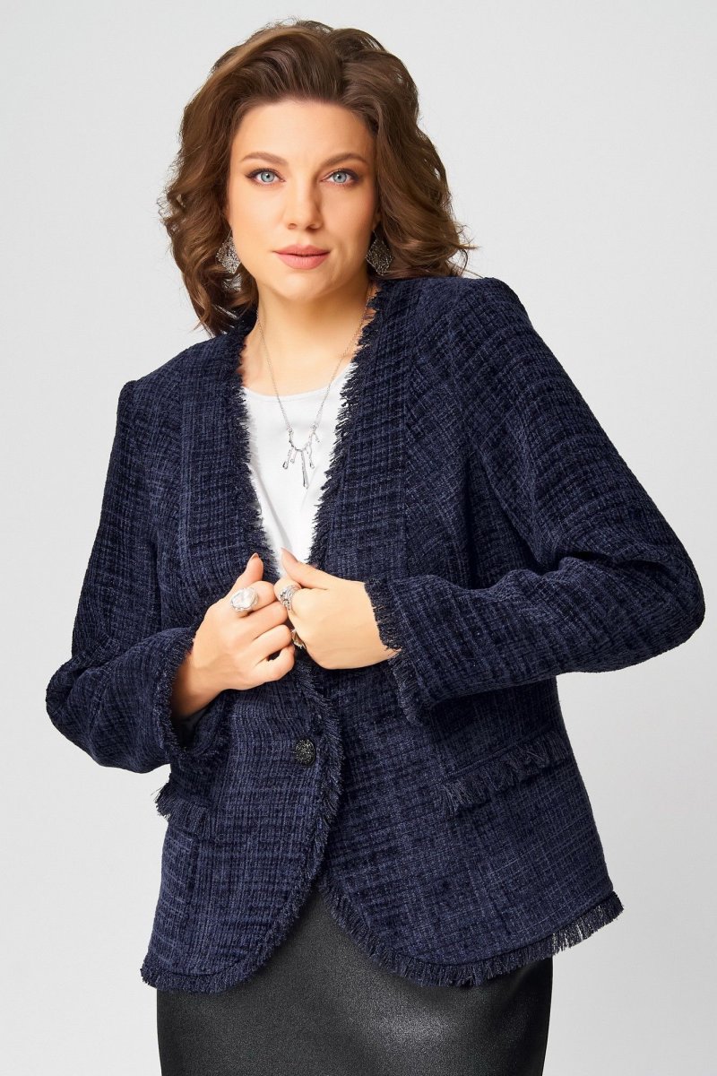 Однобортная застёжка на пуговицу, рельефные линии по полочке и спинке подчёркивают фигуру. Декоративная трепка по краю борта, низу изделия и рукавам добавляет фактурности и оригинальности.