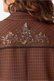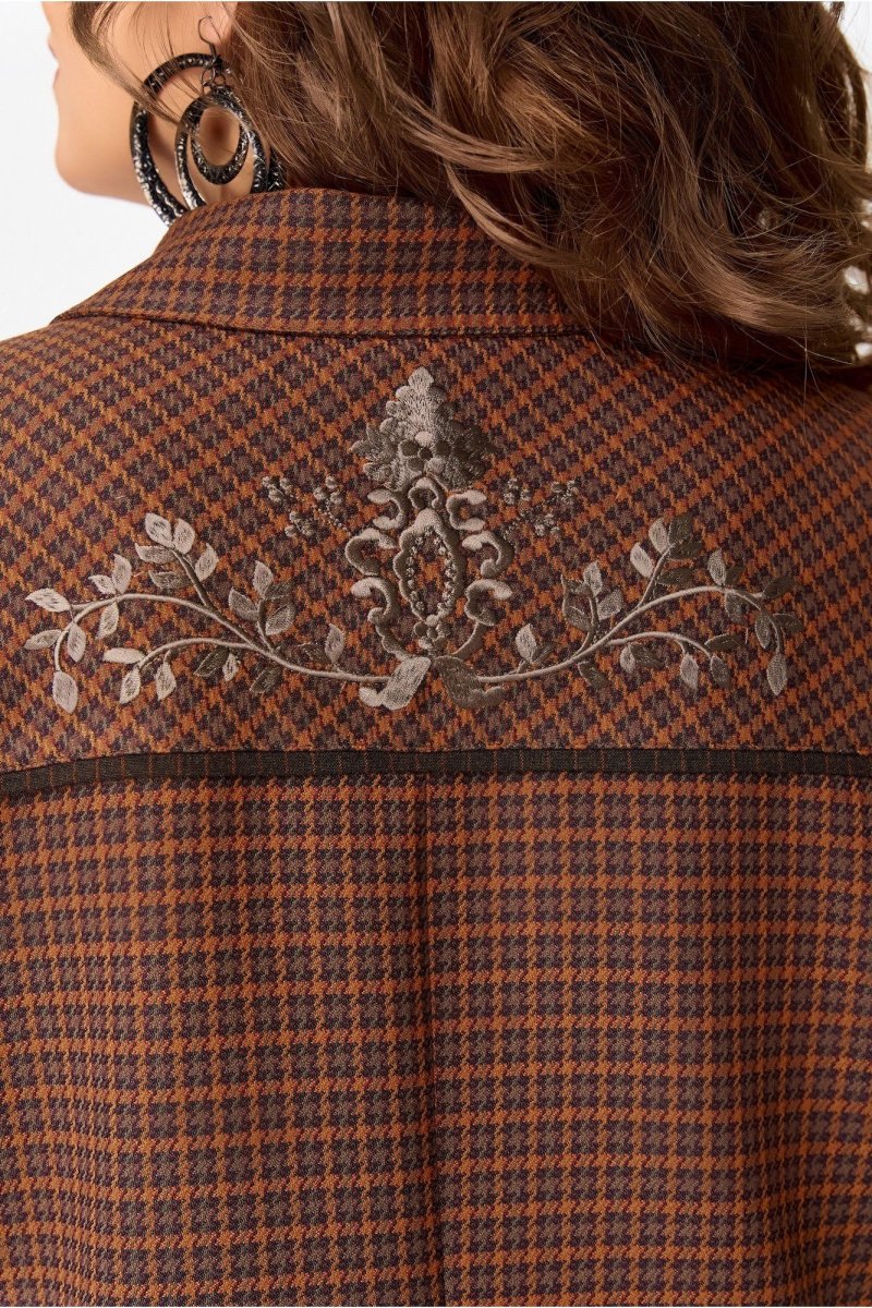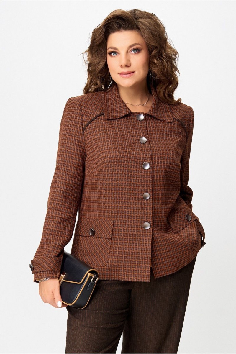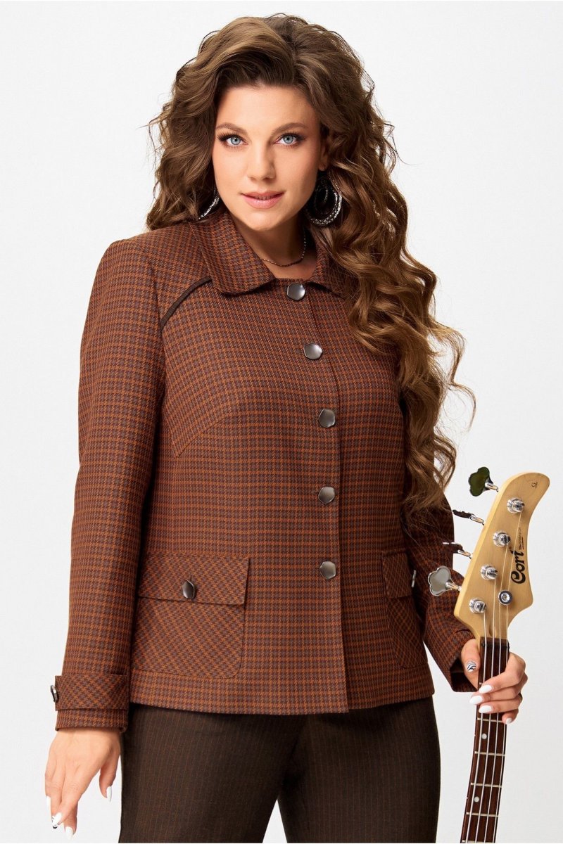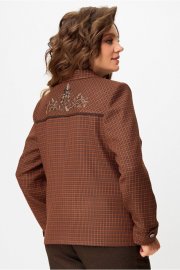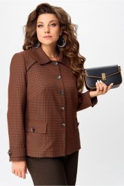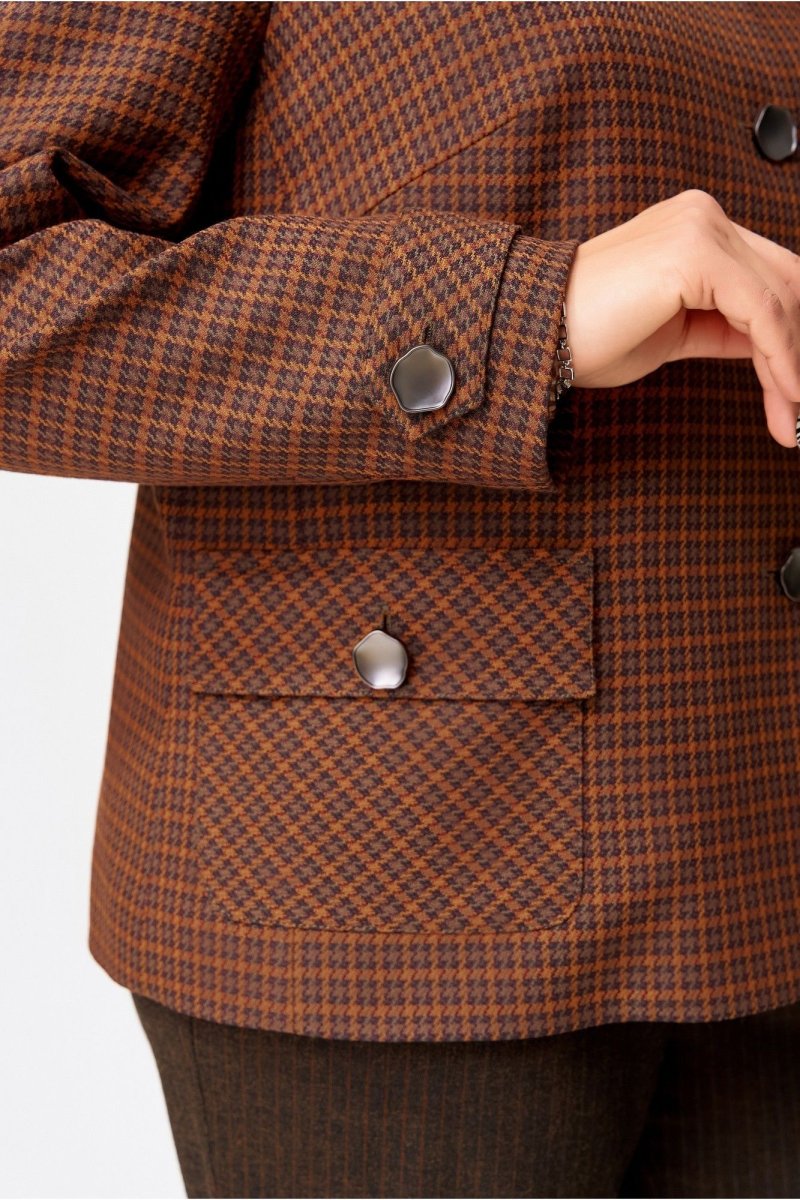 Женский стильный жакет ""Венциана"" из клетчатого текстиля, полностью на подкладке, с элегантным полуприлегающим силуэтом. Его дизайн отличает однобортная застежка на пуговицы и классический отложной воротник. Передняя часть изделия искусно оформлена нагрудными вытачками и отрезными бочками, а верхняя часть полочки украшена кокеткой с вшитым декоративным кантом. Функциональные накладные карманы с клапанами также застегиваются на пуговицы. Спинка имеет средний шов и отрезную кокетку сверху, также с декоративным кантом. Двухшовные втачные рукава завершаются декоративными патами на пуговицах.